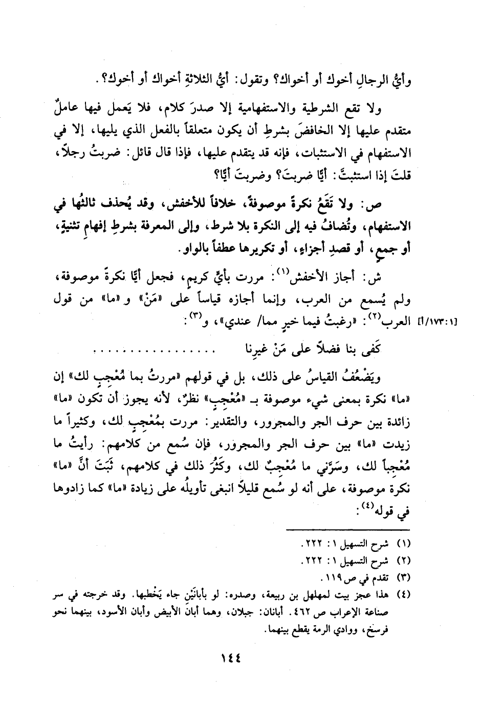 ش: أجاز الأخفش: مررت بأي كريمٍ، فجعل أيا نكرةً موصوفة، ولم يُسمع من العرب، وإنما أجازه قياسًا على "من" و "ما" من قول العرب: "رغبت فيما خيرٍ مما/ عندي"، و: