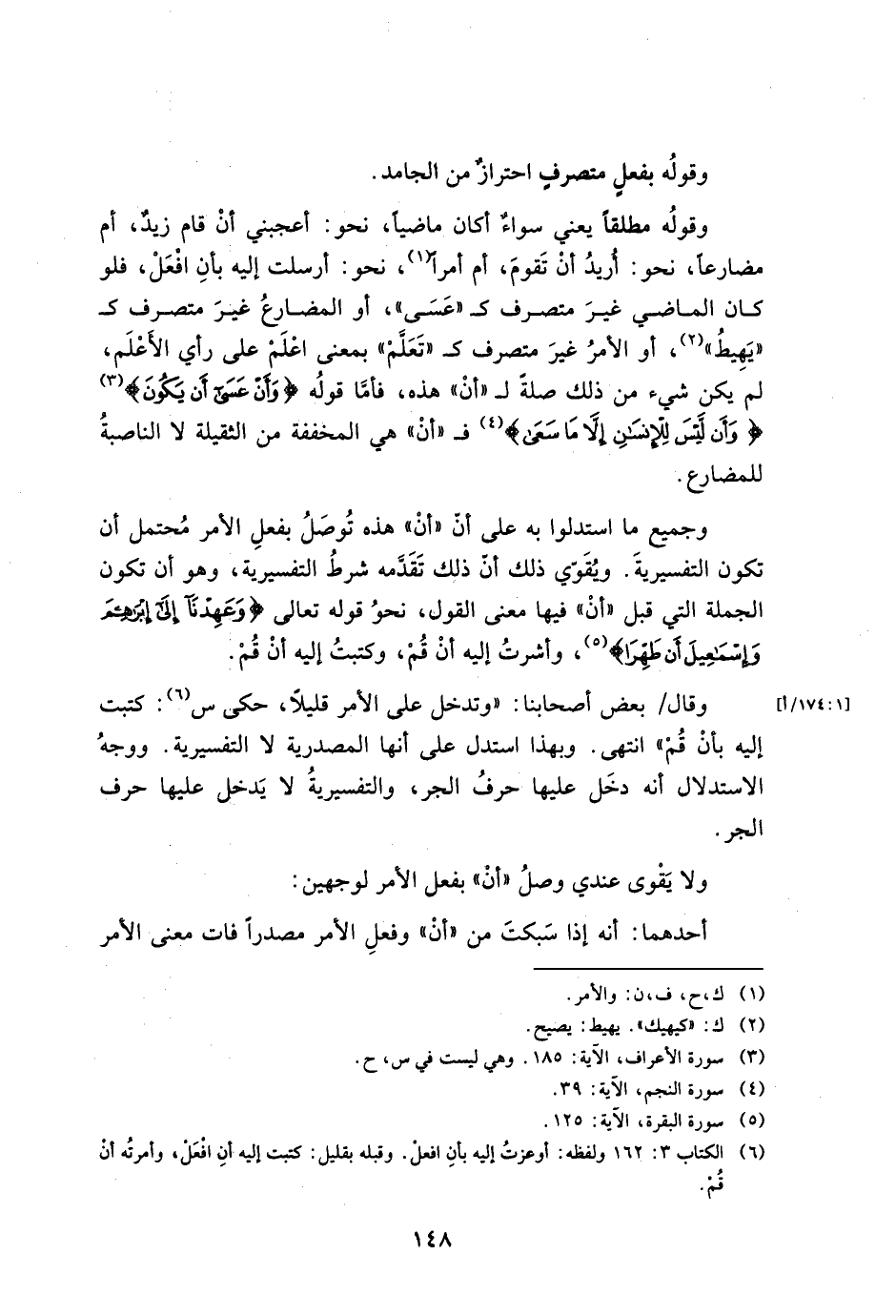 وقوله مطلقًا يعني سواءٌ أكان ماضيًا، نحو: أعجبني أن قام زيدٌ، أم مضارعًا، نحو أريد أن تقوم، أم أمرًا، نحو: أرسلت إليه بأن أفعل، فلو كان الماضي غير متصرف كـ "عسى"، أو المضارع غير متصرف كـ "يهيط"، أو الأمر غير متصرف كـ "تعلم" بمعنى اعلم على رأي الأعلم، لم يكن شيء من ذلك صلة لـ "أن" هذه، فأما قوله {وَأَنْ عَسَى أَن يَكُونَ} {وَأَن لَّيْسَ لِلإِنسَانِ} فـ "أن" هي المخففة من الثقيلة لا الناصبة للمضارع.