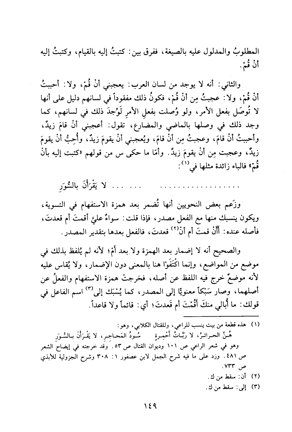 والثاني: أنه لا يوجد من لسان العرب: يعجبني أن قم، ولا: أحببت أن قم، ولا: عجبت من أن قم، فكون ذلك مفقودًا في لسانهم دليل على أنها لا توصل بفعل الأمر، ولو وصلت بفعل الأمر لوجد ذلك في لسانهم، كما وجد ذلك في وصلها بالماضي والمضارع، تقول: أعجبني أن قام زيدٌ، وأحببت أن قام، وعجبت من أن قام، ويعجبني أن يقوم زيدٌ، وأحب أن يقوم زيدٌ، وعجبت من أن يقوم زيدٌ. وأما ما حكي س من قولهم "كتبت إليه بان قم" فالباء زائدة مثلها في: