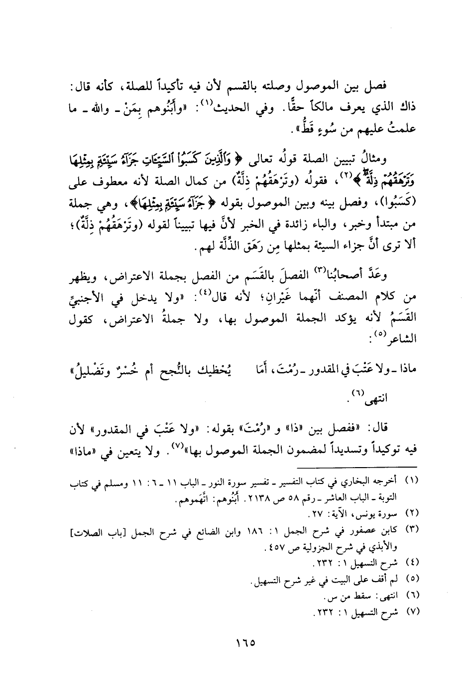 ومثال تبيين الصلة قوله تعالى {وَالَّذِينَ كَسَبُوا السَّيِّئَاتِ جَزَاءُ سَيِّئَةٍ بِمِثْلِهَا وَتَرْهَقُهُمْ ذِلَّةٌ}، فقوله (وترهقه ذلةٌ) من كمال الصلة لأنه معطوف على (كسبوا)، وفصل بينه وبين الموصول بقوله {جَزَاءُ سَيِّئَةٍ بِمِثْلِهَا}، وهي جملة من مبتدأ وخبر، والباء في الخبر لأن فيه تبيينًا لقوله (وترهقهم ذلةٌ) ألا ترى أن جزاء السيئة بمثلها من رهق الذلة لهم.