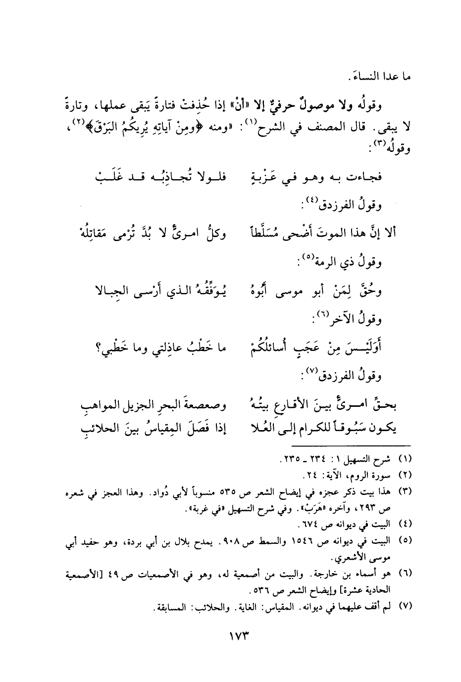 وقوله ولا موصولٌ حرفيٌ إلا "أن" إذا حذفت فتارةً يبقى عملها، وتارةً لا يبقى. قال المصنف في الشرح: "ومنه {وَمِنْ آيَاتِهِ يُرِيكُمُ الْبَرْقَ}، وقوله: