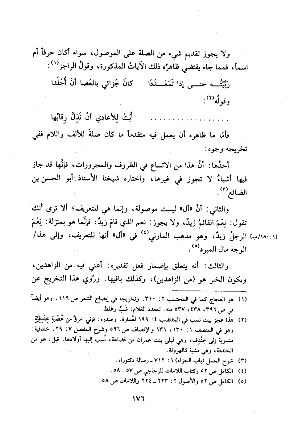 ولا يجوز تقديم شيء من الصلة على الموصول، سواء أكان حرفًا أم اسمًان فمما جاء يقتضي ظاهره ذلك الآيات المذكورة، وقول الراجز: