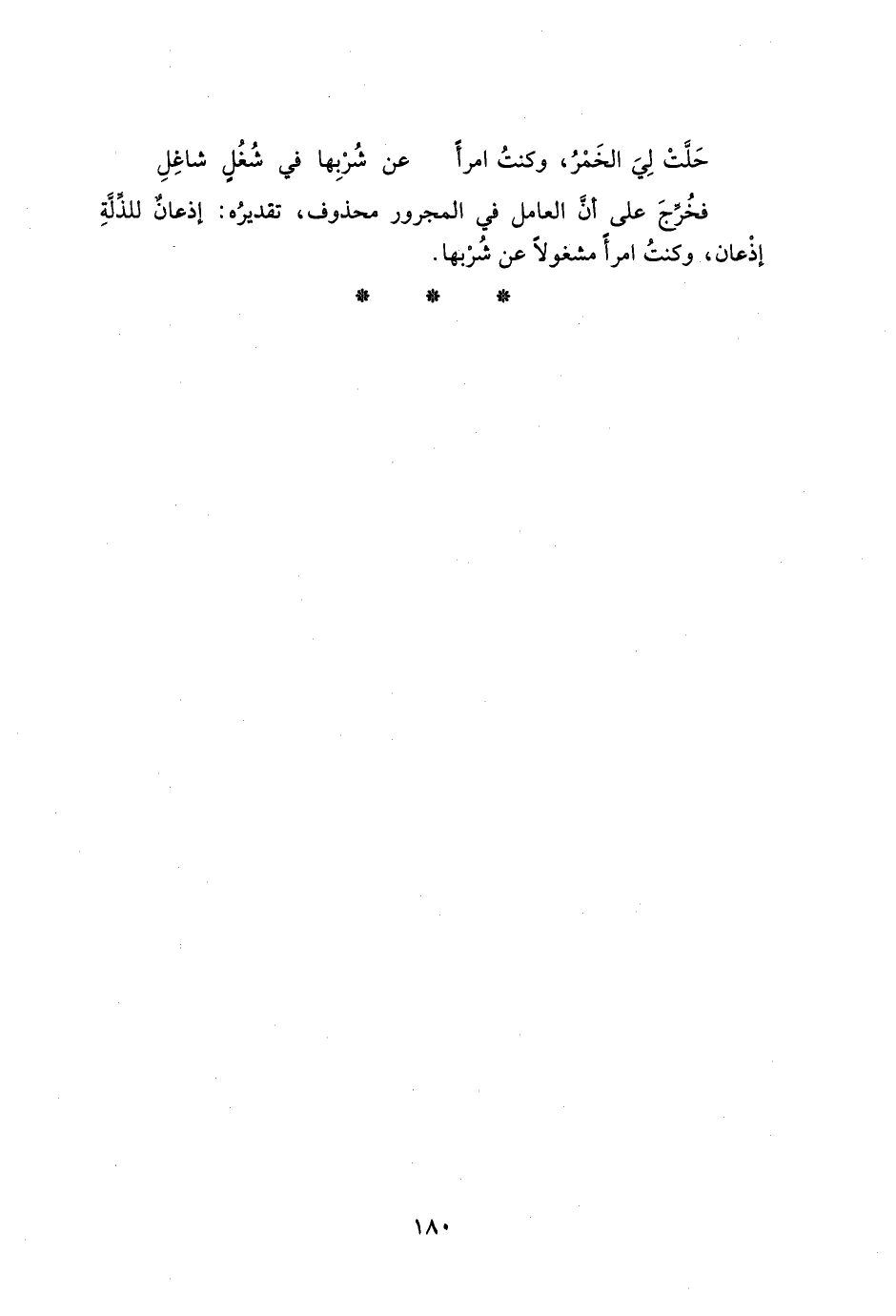 فخرج على أن العامل في المجرور محذوف، تقديره: إذعانٌ للذلة إذعان، وكنت امرأً مشغولًا عن شربها.