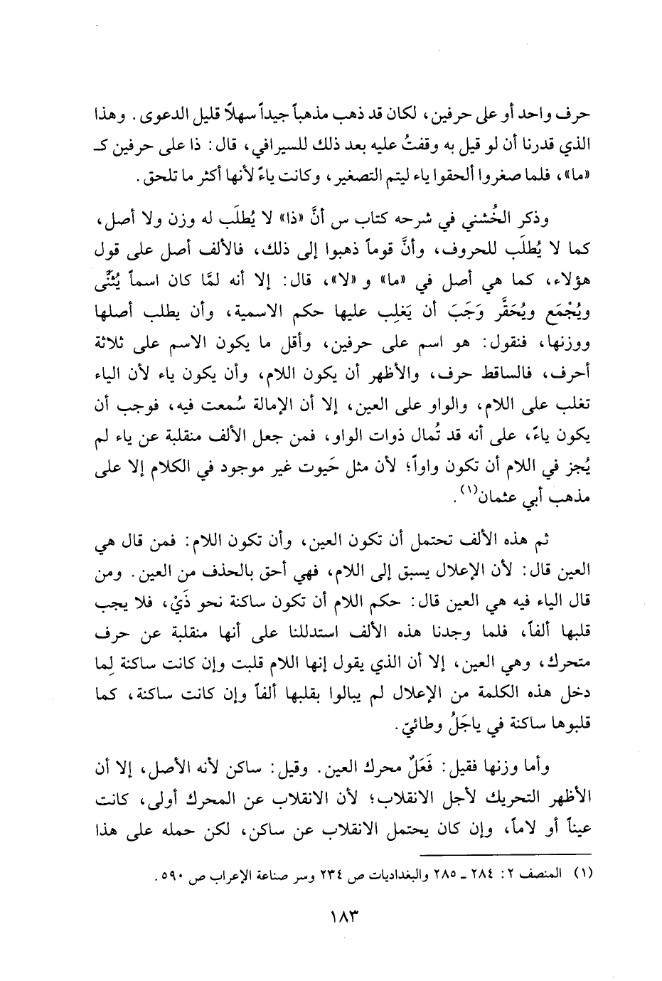 وذكر الخشني في شرحه كتاب س أن "ذا" لا يُطلب له وزن ولا أصل، كما لا يُطلب للحروف، وأن قومًا ذهبوا إلى ذلك، فالألف أصل على قول هؤلاء، كما هي أصل في "ما" و "لا"، قال: إلا أنه لما كان اسمًا يُثنى ويُجمع ويُحقر وجب أن يغلب عليها حكم الاسمية، وأن يطلب أصلها ووزنها، فنقول: هو اسم على حرفين، وأقل ما يكون الاسم على ثلاثة أحرف، فالساقط حرف، والأظهر أن يكون اللام، وأن يكون ياء لأن الياء تغلب على اللام، والواو على العين، إلا أن الإمالة سُمعت فيه، فوجب أن يكون ياءً، على أنه قد تُمال ذوات الواو، فمن جعل الألف منقلبة عن ياء لم يُجز في اللام أن تكون واوًا؛ لأن مثل حيوت غير موجود في الكلام إلا على مذهب أبي عثمان.