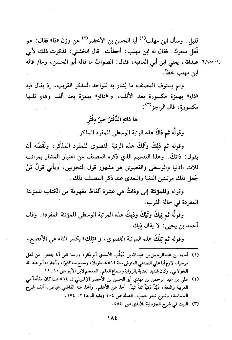 قليل. وسأل ابن مهلب أبا الحسن بن الأخضر عن وزن "ذا" فقال: هو فعل محرك. فقال له ابن مهلب: أخطأت. قال الخشني: فذكرت ذلك لأبي عبد الله، يعني ابن أبي العافية، فقال: الصواب ما قاله أبو الحسن، وما/ قاله ابن مهلب خطأ.