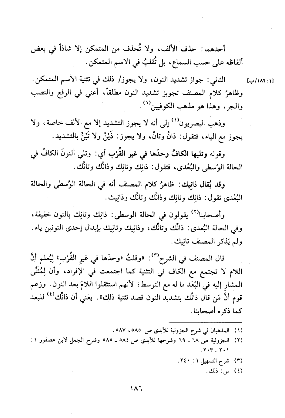 وذهب البصريون إلى أنه لا يجوز التشديد إلا مع الألف خاصة، ولا يجوز مع الياء، فتقول: ذان وتان، ولا يجوز: ذين ولا تين بالتشديد.