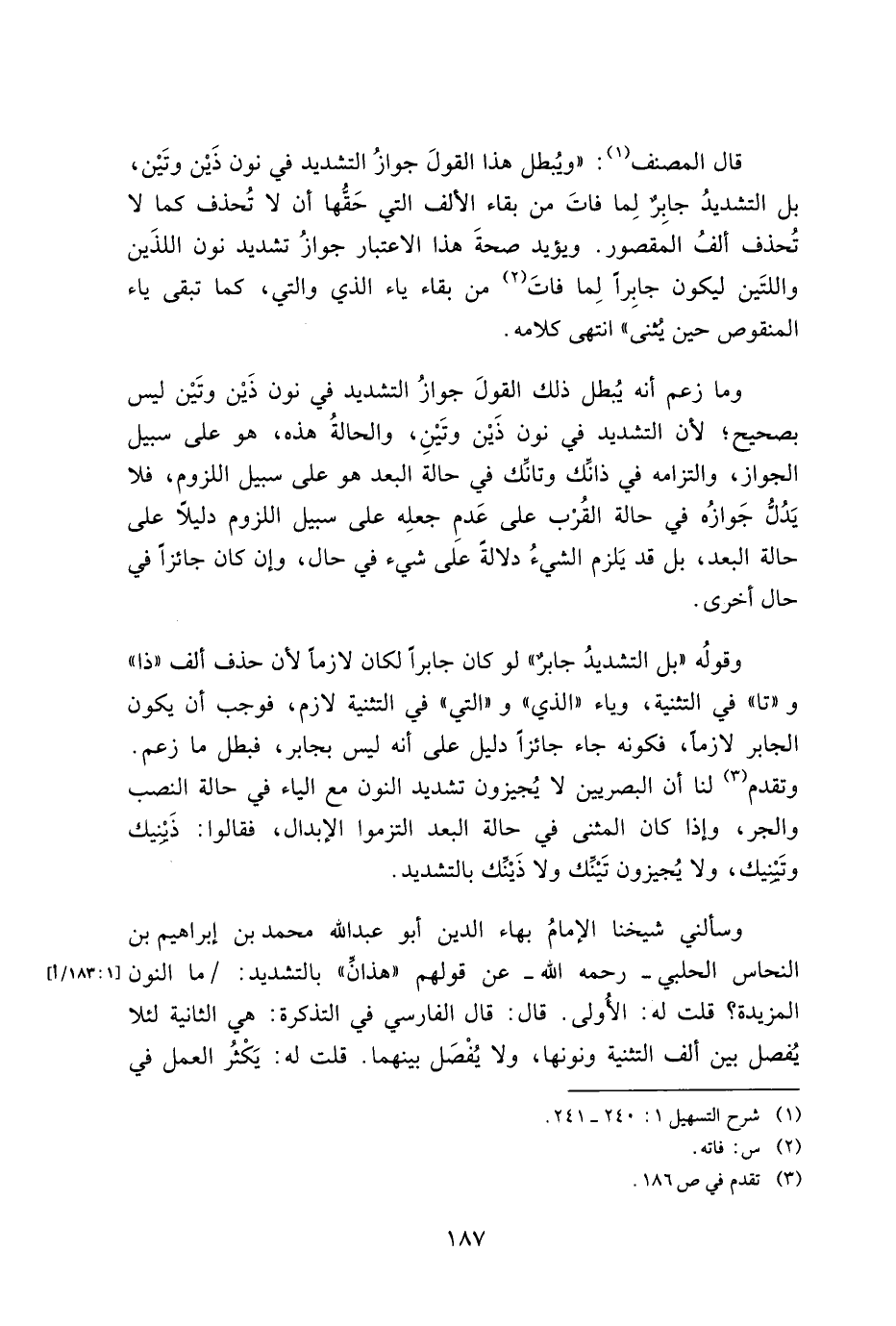 وسألني شيخنا الإمام بها الدين أبو عبد الله محمد بن إبراهيم بن النحاس الحلبي - رحمه الله - عن قولهم "هذان" بالتشديد:/ ما النون المزيدة؟ قلت له: الأولى. قال: قال الفارسي في التذكرة: هي الثانية لئلا يُفصل بين ألف التثنية ونونها، ولا يُفصل بينهما. قلت له: يكثر العمل في
