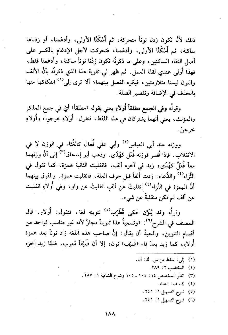 وقوله وقد يُنون حكي قُطرب تنونيه لغة، فتقول: أولاءٍ. قال المصنف في الشرح: "وتسمية تنوينًا مجازٌ لأنه غير مناسب لواحد من أقسام التنوين، والجيد أن يقال: إن صاحب هذه اللغة زاد نونًا بعد همزة أولاء، كما زيد بعد فاء "ضيف" نون، إلا أن ضيفًا مُعرب فلما زيد آخره