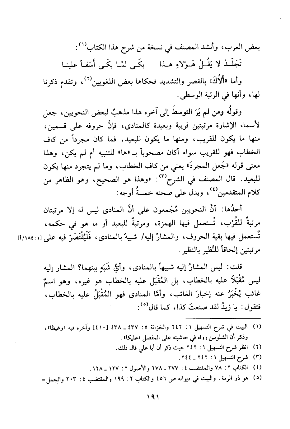 وقوله ومن لم ير التوسط إلى آخره هذا مذهب لبعض النحويين، جعل لأسماء الإشارة مرتبتين قريبة وبعيدة كالمنادى، فإن حروفه على قسمين، منها ما يكون للقريب، ومنها ما يكون للبعيد، فما كان مجردًا من كاف الخطاب فهو للقريب سواء أكان مصحوبًا بـ "ها" للتنبيه أم لم يكن، وهذا معنى قوله "جعل المجرد" يعني من كاف الخطاب، وما لم يتجرد منها يكون للبعيد. قال المصنف الشرح: "وهذا هو الصحيح، وهو الظاهر من كلام المتقدمين، ويدل على صحته خمسة أوجه: