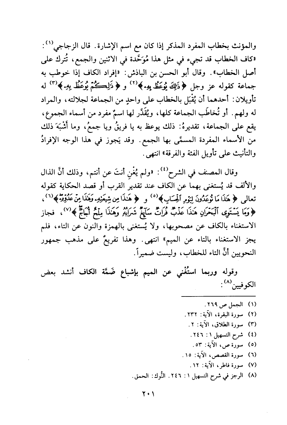 وقال المصنف في الشرح: "ولم يغن أنت عن أنتم, وذلك أن الذال والألف قد يستغنى بهما عن الكاف عند تقدير القرب أو قصد الحكاية كقوله تعالى} هَذَا مَا تُوعَدُونَ لِيَوْمِ الْحِسَابِ {و} هَذَا مِنْ شِيعَتِهِ وَهَذَا مِنْ عَدُوِّهِ {,} وَمَا يَسْتَوِي الْبَحْرَانِ هَذَا عَذْبٌ فُرَاتٌ سَائِغٌ شَرَابُهُ وَهَذَا مِلْحٌ أُجَاجٌ {, فجاز الاستغناء بالكاف عن مصحوبها, ولا يستغنى بالهمزة والنون عن التاء, فلم يجز الاستغناء بالتاء عن الميم" انتهى. وهذا تفريغ على مذهب جمهور النحويين أن التاء للخطاب, وليست ضميرا.