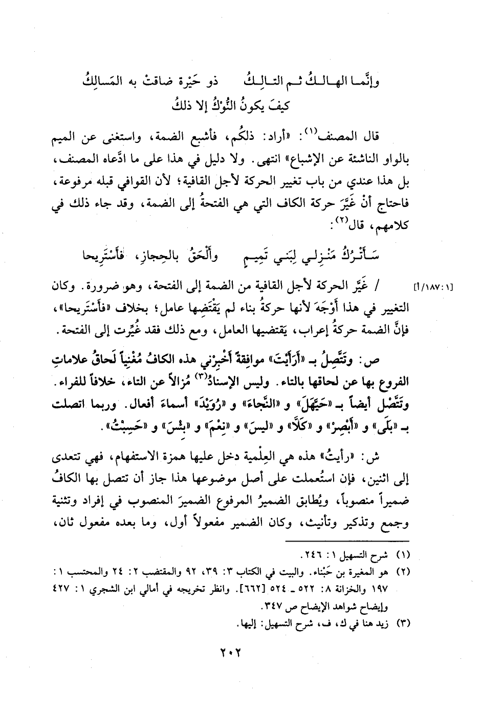 ش: "رأيت" هذه العملية دخل عليها همزة الاستفهام, فهي تتعدى إلى اثنين, فإن استعملت على أصل موضوعها هذا جاز أن تتصل بها الكاف ضميرا منصوبا, ويطابق الضمير المرفوع المنصوب في إفراد وتثنية وجمع وتذكير وتأنيث, وكان الضمير مفعولا أول, وما بعده مفعول ثان,