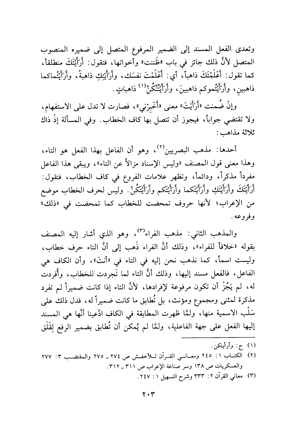 أحدها: مذهب البصريين, وهو أن الفاعل بهذا الفعل هو التاء, وهذا معنى قول المصنف "وليس الإسناد مزالا عن التاء", ويبقى هذا الفاعل مفردا مذكرا, ودائما, وتظهر علامات الفروع في كاف الخطاب, فتقول: أرأيتك وأرأيتك وأرأيتكما وأرأيتكم وأرأيتكن. وليس لحرف الخطاب موضع من الإعراب؛ لأنها حروف تمحضت للخطاب كما تمحضت في "ذلك" وفروعه.