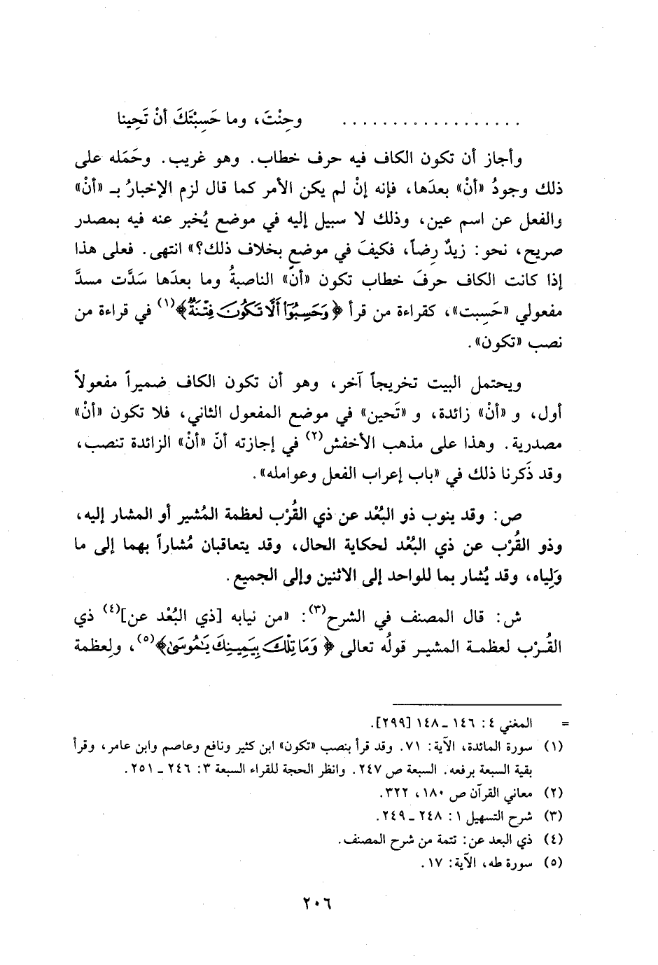 وأجاز أن تكون الكاف فيه حرف خطاب. وهو غريب. وحمله على ذلك وجود "أن" بعدها, فإنه إن لم يكن الأمر كما قال لزم الإخبار بـ "أن" والفعل عن اسم عين, وذلك لا سبيل إليه في موضع يخبر عنه فيه بمصدر صريح, نحو: زيد رضا, فكيف غي موضع بخلاف ذلك؟ " انتهى. فعلى هذا إذا كانت الكاف حرف خطاب تكون "أن" الناصبة وما بعدها سدت مسد مفعولي "حسبت", كقراءة من قرأ} وَحَسِبُوا أَلَّا تَكُونَ فِتْنَةٌ {في قراءة من نصب "تكون".