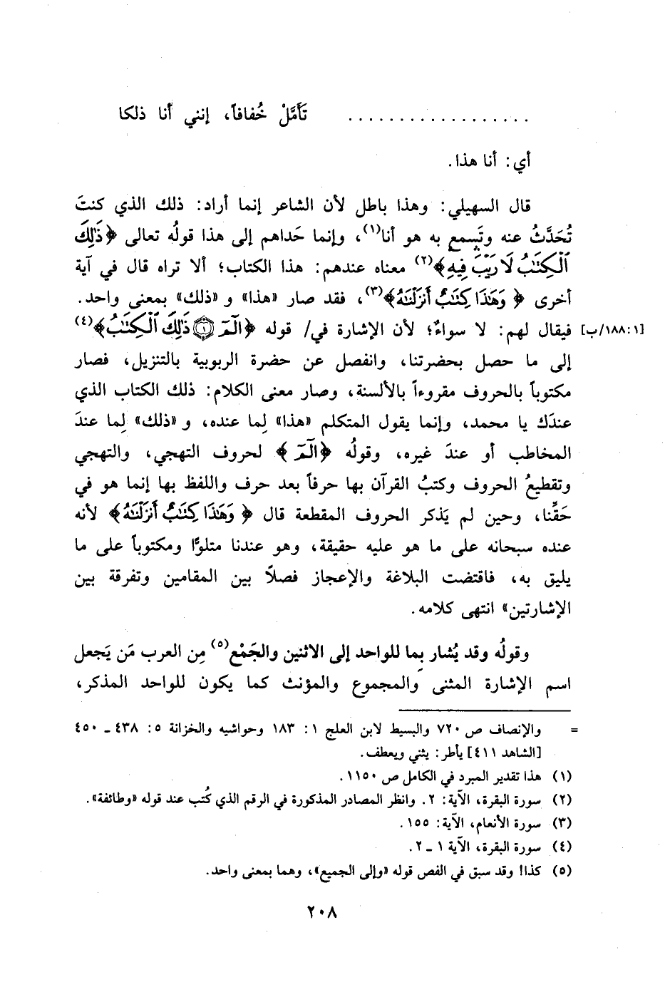 قال السهيلي: وهذا باطل لأن الشاعر إنما أراد: ذلك الذي كنت تحدث عنه وتسمع به هو أنا, وإنما حداهم إلى هذا قوله تعالى} ذَلِكَ الْكِتَابُ لَا رَيْبَ فِيهِ {معناه عندهم: هذا الكتاب؛ ألا تراه قال في آية أخرى} وَهَذَا كِتَابٌ أَنْزَلْنَاهُ {, فقد صار "هذا" و "ذلك" بمعنى واحد. فيقال لهم: لا سواء؛ لأن الإشارة في/ قوله} الم (١) ذَلِكَ الْكِتَابُ {إلى ما حصل بحضرتنا, وانفصل عن حضرة الربوبية بالتنزيل, فصار مكتوبا بالحروف مقروءا بالألسنة, وصار معنى الكلام: ذلك الكتاب الذي عندك يا محمد, وإنما يقول المتكلم "هذا" لما عنده, و "ذلك" لما عند المخاطب أو عند غيره, وقوله} الم {لحروف التهجي, والتهجي وتقطيع الحروف وكتب القرآن بها حرفا بعد حرف واللفظ بها إنما هو في حقنا, وحين لم يذكر الحروف المقطعة قال} وهذا كتاب أنزلناه {لأنه عنده سبحانه على ما هو عليه حقيقة, وهو عندنا متلوا ومكتوبا على ما يليق به, فاقتضت البلاغة والإعجاز فصلا بين المقامين وتفرقة بين الإشارتين" انتهى كلامه.