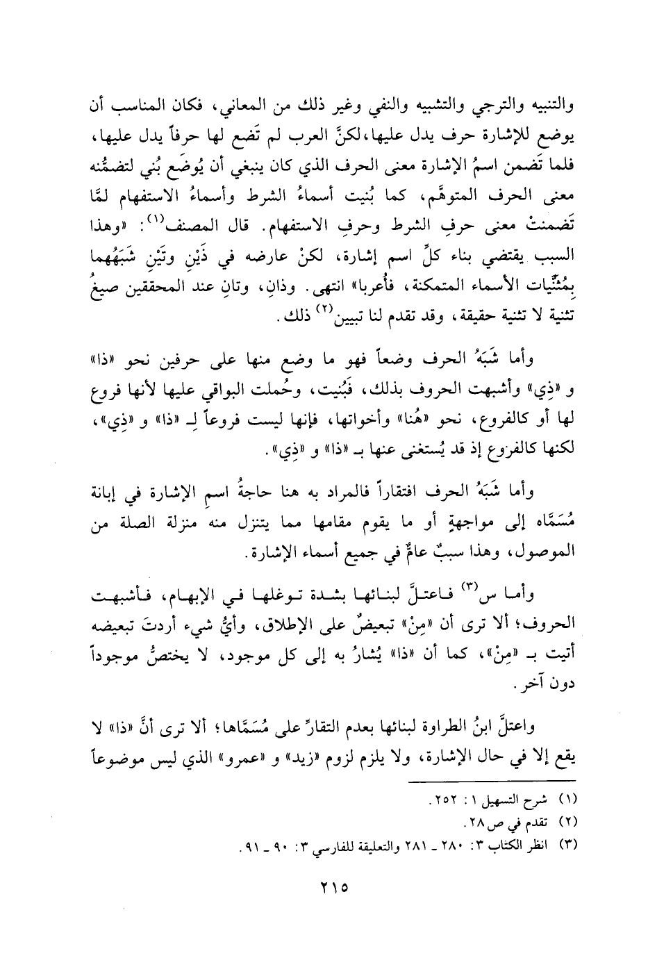 والتنبيه والترجي والتشبيه والنفي وغير ذلك من المعاني, فكان المناسب أن يوضع للإشارة حرف يدل عليها, لكن العرب لم تضع لها حرفاً يدل عليها, فلما تضمن اسم الإشارة معنى الحرف المتوهم, كما بينت أسماء الشرط وأسماء الاستفهام لما تضمنت معنى حرف الشرط وحرف الاستفهام. قال المصنف:" وهذا السبب يقتضي بناء كل اسم إشارة لكن عارضه في زين وتين شبههما بمثنيات الأسماء المتمكنة فأعربا" انتهى. وذان وتأن عند المحققين صيغ تثنية لا تثنية حقيقة وقدم لنا تبيين ذلك.