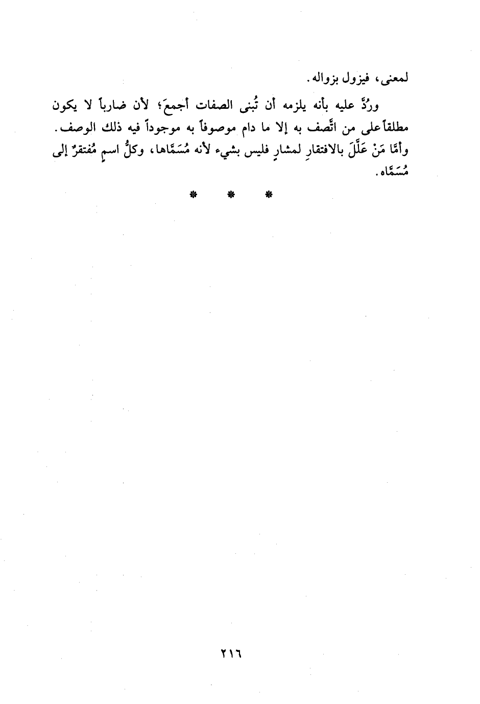 ورد عليه بأنه يلزمه أن تبني الصفات أجمع لأن ضاربا لا يكون مطلقاً على من اتصف به إلا ما دام موصوفاً به موجوداً فيه ذلك الوصف. وأما من علل بالافتقار لمشار فليس بشيء لأنه ميماها وكل اسم مفتقر إلى مسماه.