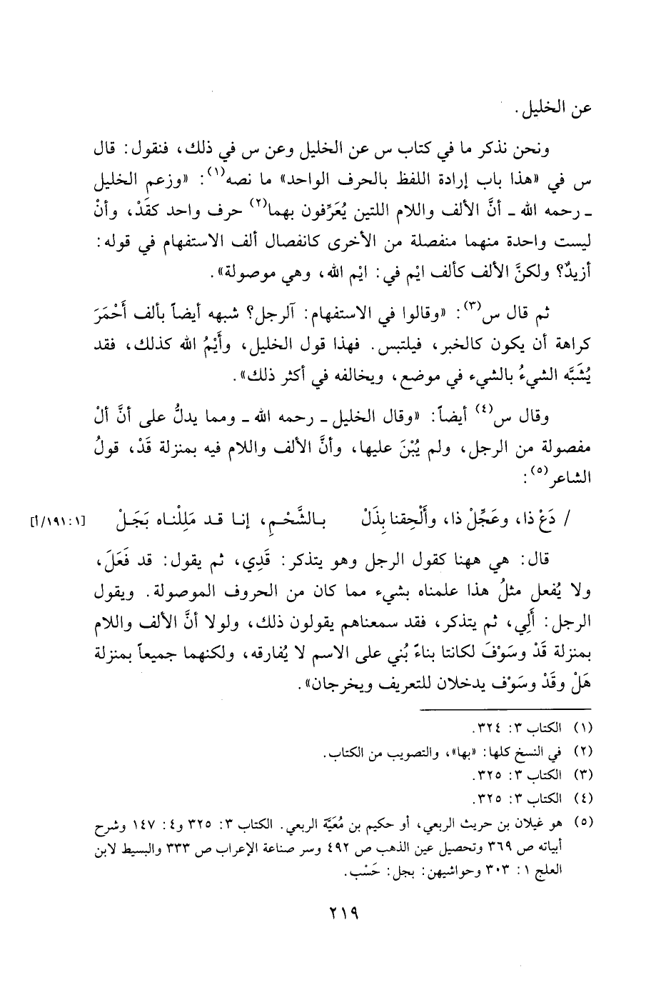 ونحن نذكر ما في كتاب س عن الخليل وعن س في ذلك فتقول: قال س في " هذا باب إرادة اللفظ بالحرف الواحد" ما نصه: " زعم الخليل - رحمه الله -أن الألف واللام اللتين يعرفون بهما حرف واحد كقد, وأن ليست واحدة منهما منفصلة من الأخرى كانفصال ألف الاستفهام في قوله: أزيد؟ ولكن الألف كألف أيم في: أيم الله وهي موصولة".