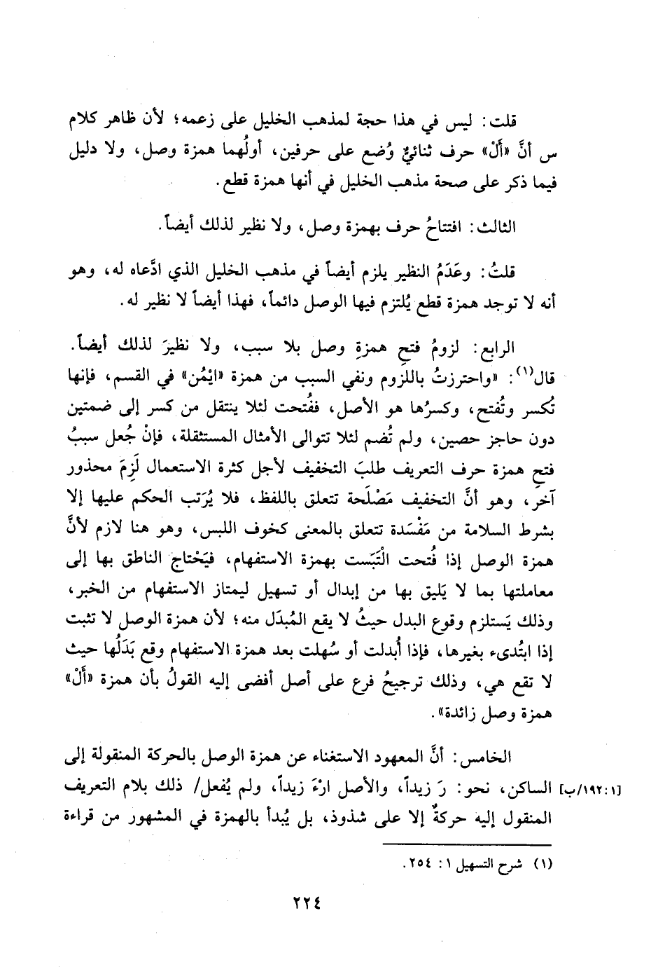 قلت: وعدم النظير يلزم أيضاً في مذهب الخليل الذي ادعاه له, وهو أنه لا توجد همزة قطع يلتزم فيها الوصل دائماً فهذا أيضا لا نظير له.