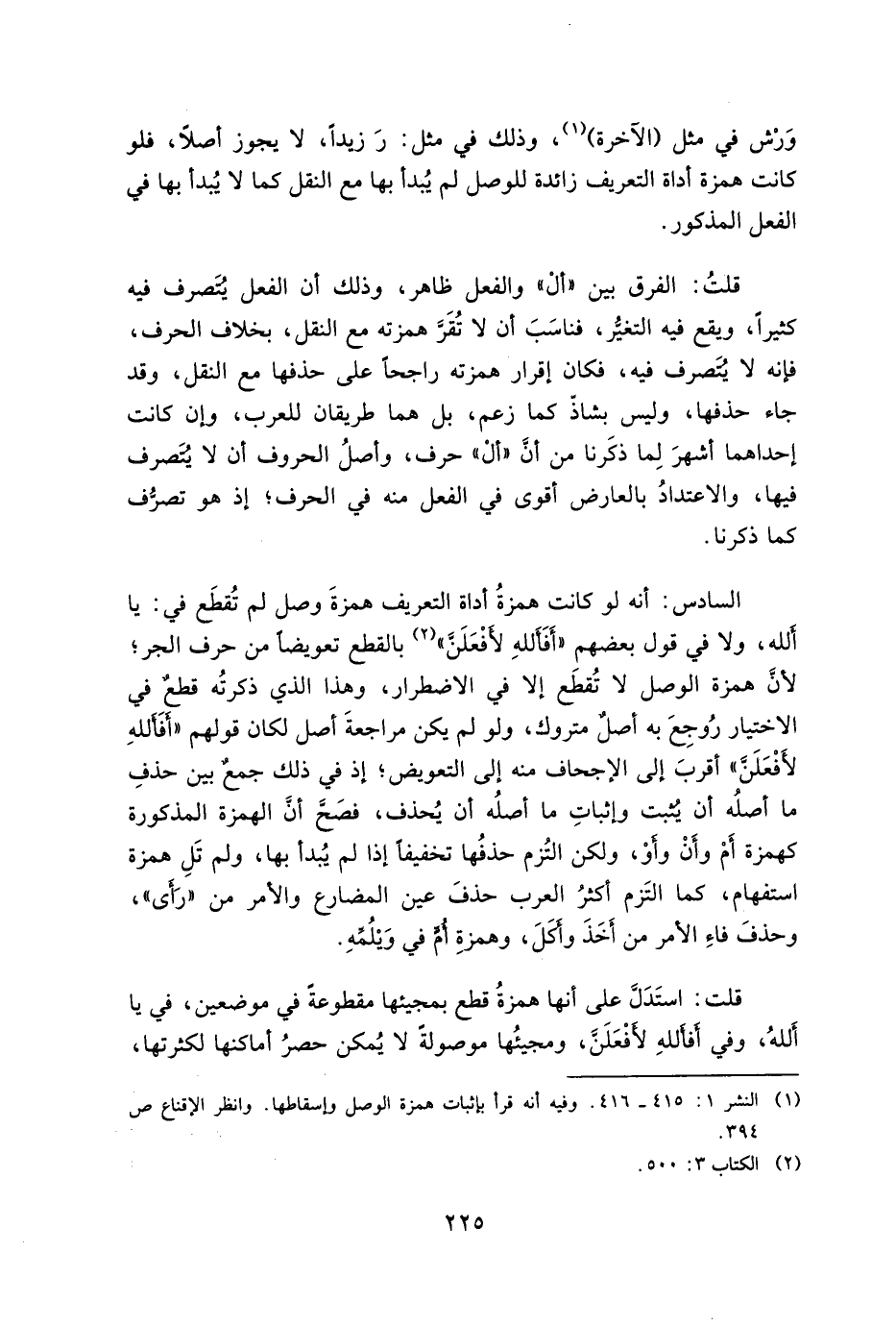 السادس: أنه لو كانت همزة أداة التعريف همزة وصل لم تقطع في: يا الله, ولا في قول بعضهم " افألله لأفعلن" بالقطع تعويضاً من حرف الجر, لأن همزة الوصل لا تقطع إلا في الاضطرار, وهذا الذي ذكرته قطع في الاختيار روجع به أصل متروك, ولو لم يكن مراجعة أصل لكان قولهم " أفأ لله لأفعلن" أقرب إلى الإجحاف منه إلى التعويض إذ في ذلك جمع بين حذف ما أصله أن يثبت وإثبات ما أصله أن يحذف فصح أن الهمزة المذكورة كهمزة أم وأن وأو ولكن التزم حذفها تخفيفاً إذا لم يبدأ بها ولم تل همزة استفهام, كما التزم أكثر العرب حذف عين المضارع والأمر من "رأى" وحذف فاء الأمر من أخذ وأكل وهمزة أم في ويلمه.