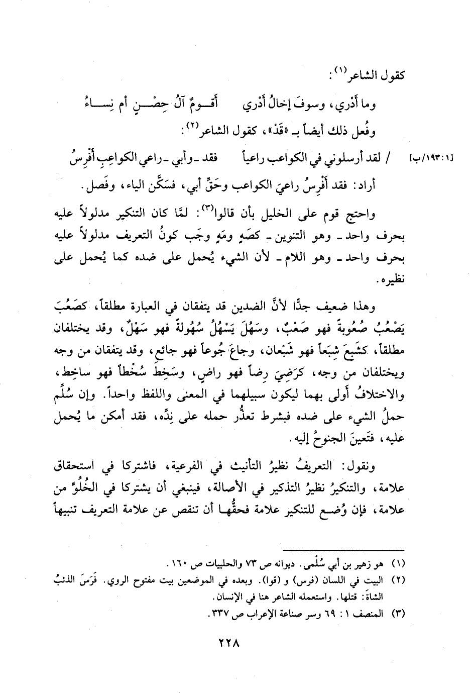 واحتج قوم على الخليل بأن قالوا: لما كان التنكير مدلولاً عليه بحرف واحد- وهو التنوين- كصة ومه وجب كون التعريف مدلولاً عليه بحرف واحد- وهو اللام- لأن الشيء يحمل على ضده كما يحمل على نظيره.
