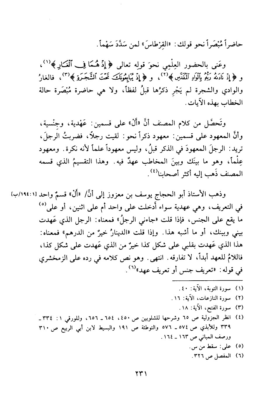 وعنى بالحضور العلمي نحو قوله تعالى {إِذْ هُمَا فِي الْغَارِ} و {إِذْ نَادَاهُ رَبُّهُ بِالْوَادِ الْمُقَدَّسِ} و {إِذْ يُبَايِعُونَكَ تَحْتَ الشَّجَرَةِ}، فالغار والوادي والشجرة لم يجر ذكرها قبل لفظًا، ولا هي حاضرة مبصرة حالة الخطاب بهذه الآيات.