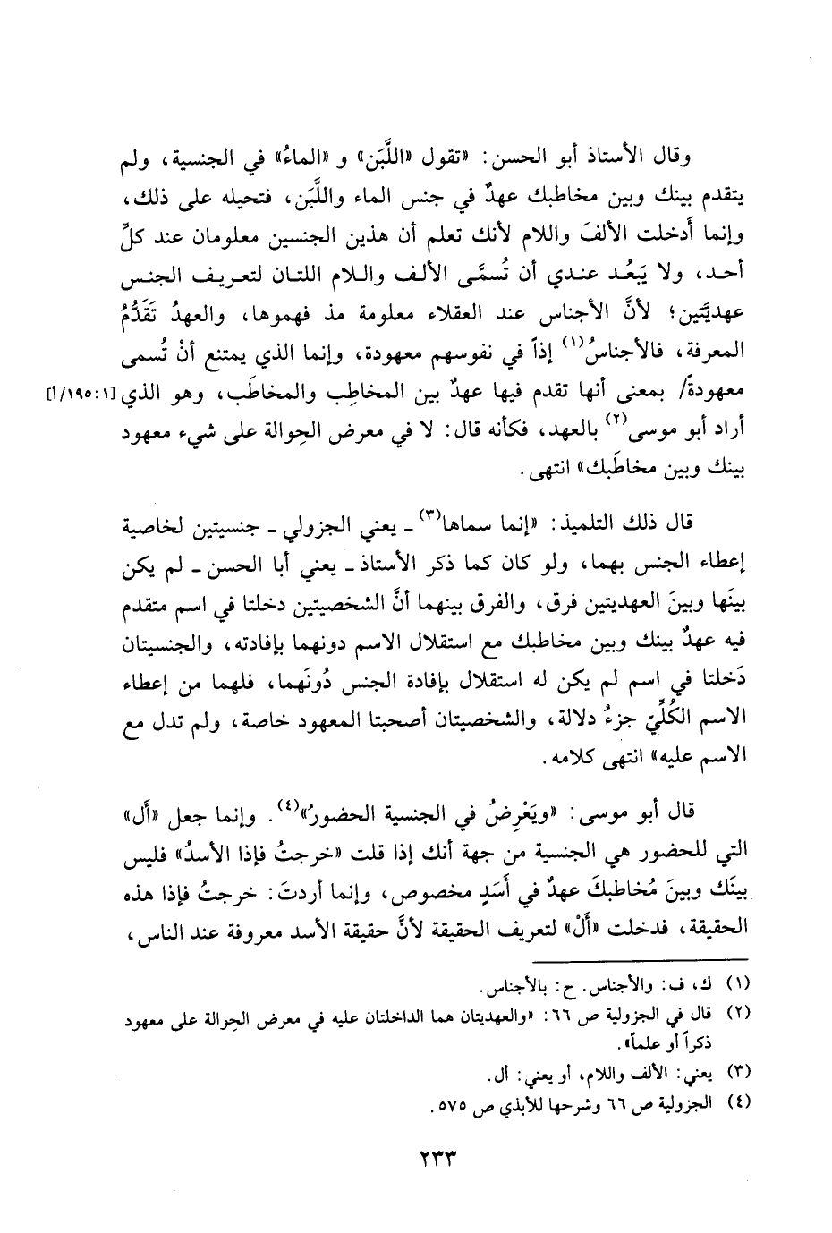 قال ذلك التلميذ: "إنما سماها- يعني الجزولي - جنسيتين لخاصية إعطاء الجنس بهما, ولو كان كما ذكر الأستاذ - يعني أبا الحسن- لم يكن بينها وبين العهديتين فرق, والفرق بينهما أن الشخصيتين دخلتا في اسم متقدم فيه عهد بينك وبين مخاطبك مع استقلال الاسم دونهما بإفادته , والجنسيتان دخلتا في اسم لم يكن له استقلال بإفادة الجنس دونهما فلهما من إعطاء الاسم الكلي جزء دلالة, والشخصيتان أصبحتا المعهود خاصة ولم تدل مع الاسم عليه" انتهى كلامه.