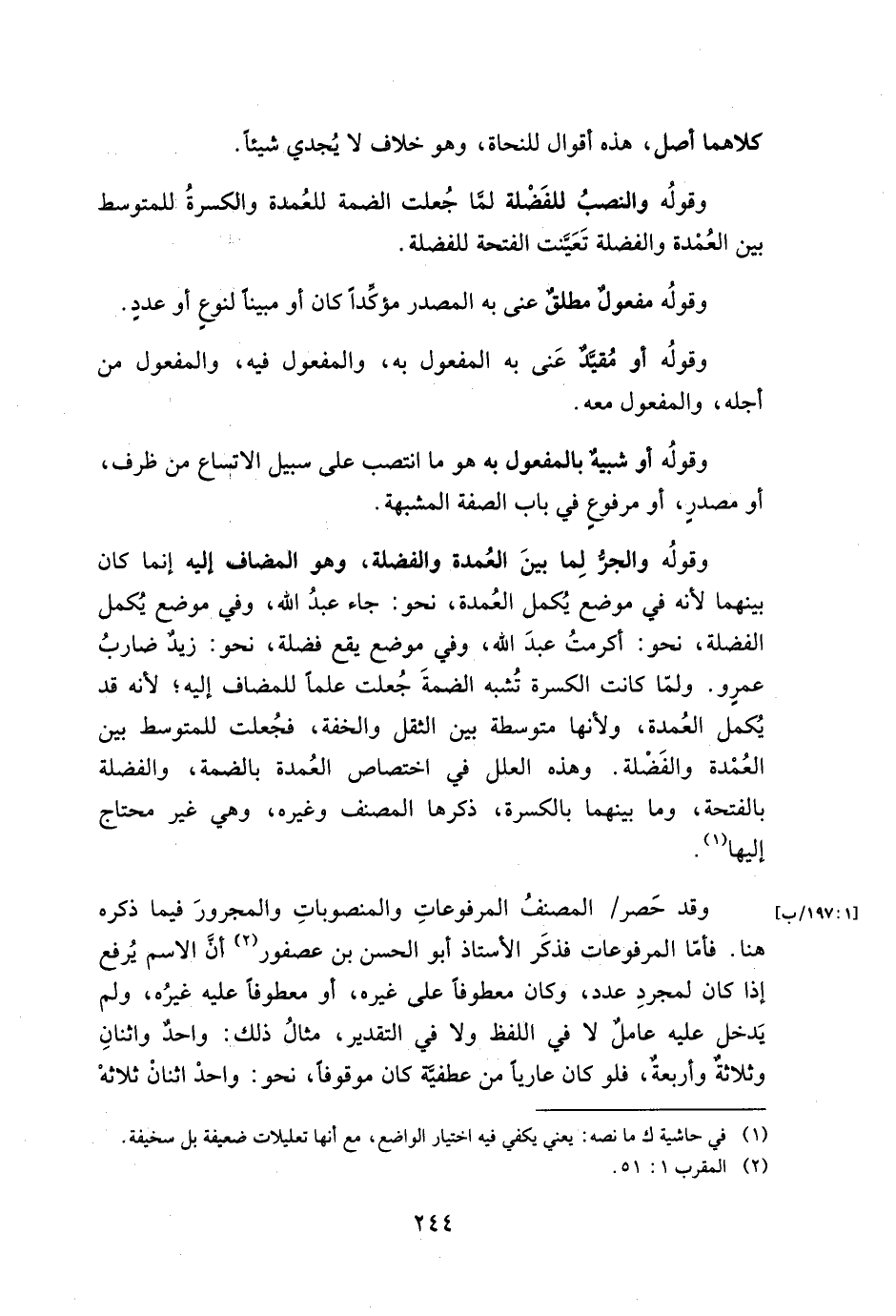 وقوله أو شبيه بالمفعول به هو ما انتصب على سبيل الاتساع من ظرف, أو مصدر, أو مرفوع في باب الصفة المشبهة.