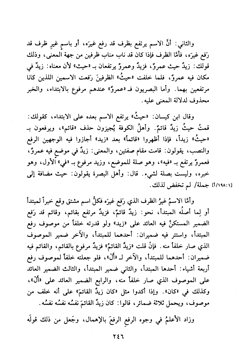 وقال ابن كيسان: "حيث" يرتفع الاسم بعده على الابتداء, كقولك: قمت حيث زيد قائم. وأهل الكوفة يجيزون حذف "قائم", ويرفعون بـ "حيث" زيدا, فإذا أظهروا "قائما" بعد "زيد" أجازوا فيه الوجهين الرفع والنصب, يقولون: قامت مقام صفتين, والمعنى: زيد في موضع فيه عمرو, فعمرو يرتفع بـ "فيه", وهو صلة للموضع, وزيد مرفوع بـ "في" الأول, وهو خبره, وليست بصلة لشيء. قال: وأهل البصرة يقولون: حيث مضافة إلى جملة/ لم تخفض لذلك.
