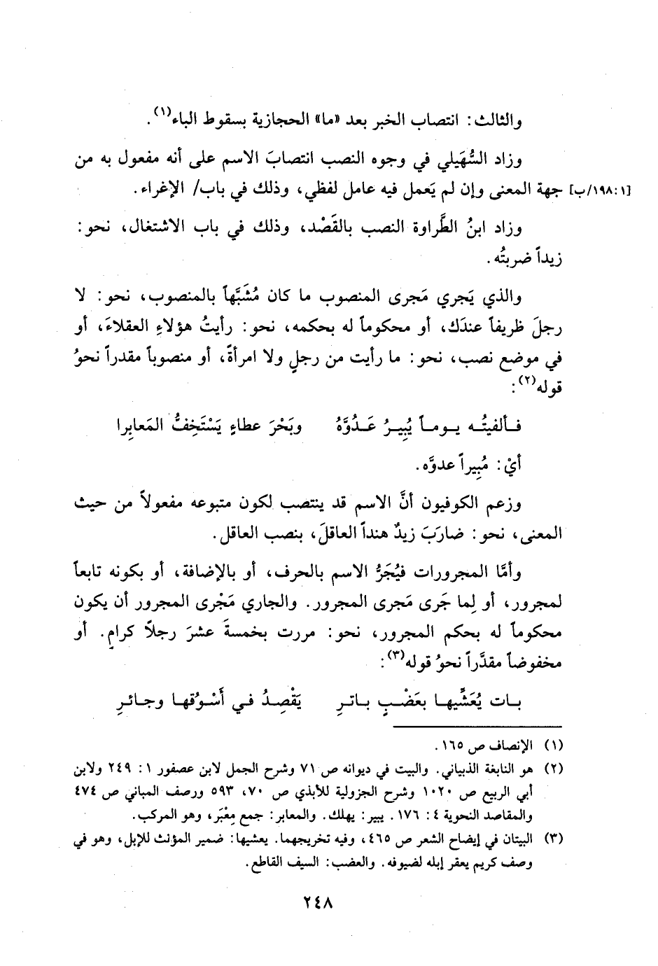 والذي يجري مجرى المنصوب ما كان مشبها بالمنصوب, نحو: لا رجل ظريفا عندك, أو محكوما له بحكمه, نحو: رأيت هؤلاء العقلاء, أو في موضع نصب, نحو: ما رأيت من رجل ولا امرأة, أو منصوبا مقدرا نحو قوله: