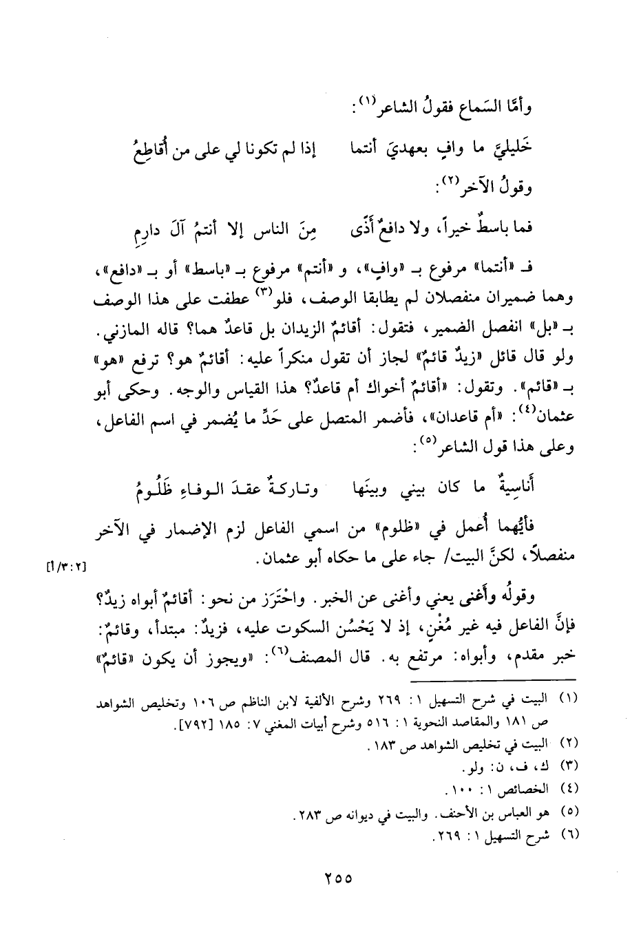 في "أنتما" مرفوع بـ "واف"، و"أنتم" مرفوع بـ "باسط" أو بـ "دافع"، وهما ضميران منفصلان لم يطابقا الوصف، فلو عطفت على هذا الوصف بـ "بل" انفصل الضمير، فتقول: أقائم الزيدان بل قاعد هما؟ قاله المزني. ولو قال قائل "زيد قائم" لجاز أن تقول منكرًا عليه: أقائم هو؟ ترفع "هو" بـ "قائم". وتقول: "أقائم أخواك أم قاعد؟ هذا القياس والوجه. وحكى أبو عثمان: "أم قاعدان"، فأضمر المتصل على حد ما يضمر في اسم الفاعل، وعلى هذا قول الشاعر:
