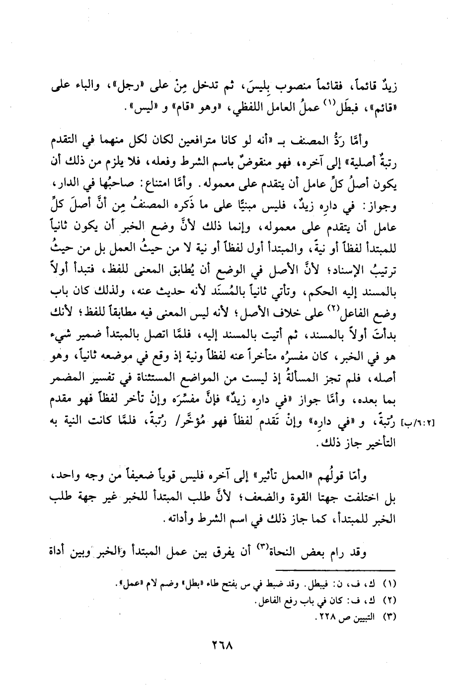وأما رد المصنف بـ "أنه لو كانا مترافعين لكان لكل منهما في التقدم رتبة أصلية" إلى آخره، فهو منقوض باسم الشرط وفعله، فلا يلزم من ذلك أن يكون أصل كل عامل أن يتقدم على معموله. وأما امتناع: صاحبها في الدار، وجواز: في دار زيد، فليس مبنيًا على ما ذكره المصنف من أن أصل كل عامل أن يتقدم على معموله، وإنما ذلك لأن وضع الخبر أن يكون ثانيًا للمبتدأ لفظًا أو نية، والمبتدأ أول لفظًا أو نية لا من حيث العمل بل من حيث ترتيب الإسناد؛ لأن الأصل في الوضع أن يطابق المعنى للفظ، فتبدأ أولًا بالمسند إليه الحكم، وتأتي ثانيًا بالمسند لأنه حديث عنه، ولذلك كان باب وضع الفاعل على خلاف الأصل؛ لأنه ليس بالمعنى فيه مطابقًا للفظ؛ لأنك بدأت أولًا بالمسند، ثم أتيت بالمسند إليه، فلما اتصل بالمبتدأ ضمير شيء هو في الخبر، كان مفسره متأخرًا عنه لفظًا ونية إذ وقع في موضعه ثانيًا، وهو أصله، فلم تجز المسألة إذ ليست من المواضع المستثناة في تفسير المضمر بما بعده، وأما جواز "في داره زيد" فإن مفسره وإن تأخر لفظًا فهو مقدم رتبة، و"في داره" وإن تقدم لفظًا فهو مؤخره/ رتبة، فلما كانت النية به التأخير جاز ذلك.
