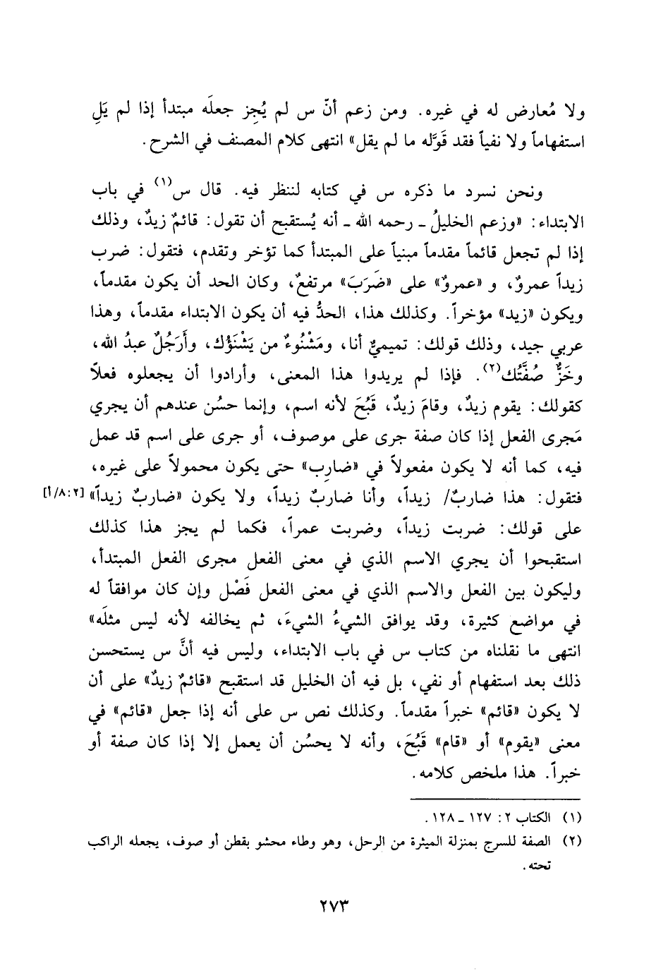ونحن نسرد ما ذكره س في كتابه لننظر فيه. قال س في باب الإبتداء: "وزعم الخليل- رحمه الله- أنه يستقبح أن تقول: قائم زيد، وذلك إذا لم تجعل قائمًا مقدمًا مبنيًا على المبتدأ كما تؤخر وتقدم، فتقول: ضرب زيدًا عمرو، و "عمرو "على "ضرب "مرتفع، وكان الحد أن يكون مقدمًا، ويكون "زيد "مؤخرًا. وكذلك هذا، الحد فيه أن يكون الإبتداء مقدمًا، وهذا عربي جيد، وذلك قولك: تميمي أنا، ومشنوء من يشنؤك، وأرجل عبد الله، وخز صفتك. فإذا لم يريدوا هذا المعنى، وأرادوا أن يجعلوه فعلاً كقولك: يقوم زيد، وقام زيد، قبح لأنه اسم، وإنما حسن عندهم أن يجري مجرى الفعل إذا كان صفة جرى على موصوف، أو جرى على اسم قد عمل فيه، كما أنه لا يكون مفعولاً في "ضارب "حتى يكون محمولاً على غيره، فتقول: هذا ضارب/ زيدًا، وأنا ضارب زيدًا، ولا يكون "ضارب زيدًا "على قولك: ضربت زيدًا، وضربت عمرًا، فكما لم يجز هذا كذلك استقبحوا أن يجري الاسم الذي في معنى الفعل مجرى الفعل المبتدأ، وليكون بين الفعل والاسم الذي في معنى الفعل فصل وإن كان موافقًا له في مواضع كثيرة، وقد يوافق الشيء الشيء، ثم يخالفه لأنه ليس مثله "انتهى ما نقلناه من كتاب س في باب الابتداء، وليس فيه أن س يستحسن ذلك بعد استفهام أو نفي، بل فيه أن الخليل قد استقبح "قائم زيد "على أن لا يكون "قائم "خبرًا مقدمًا. وكذلك نص س على أنه إذا جعل "قائم " في معنى "يقوم "أو "قام "قبح، وأنه لا يحسن أن يعمل إلا إذا كان صفة أو خبرًا. هذا ملخص كلامه.
