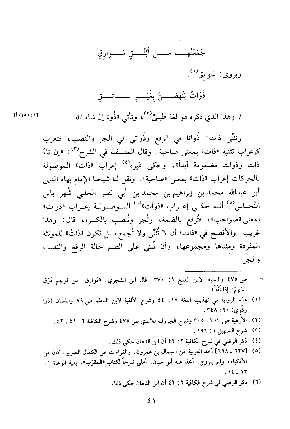 وتثنى ذات: ذواتا في الرفع وذواتي في الجر والنصب، فتعرب كإعراب تثنيةً "ذات" بمعنى صاحبةً. وقال المصنف في الشرح: "إن تاء ذات وذوات مضمومةً أبدًا، وحكي غيره إعراب "ذات" الموصولةً بالحركات إعراب "ذات" بمعنى "صاحبة". ونقل لنا شيخنا الإمام بهاء الدين أبو عبد الله محمد بن إبراهيم بن محمد بن أبي نمر الحلبي شهر بابن النحاس أنه حكي إعراب "ذوات" الموصولة إعراب "ذوات" بمعنى "صواحب", فترفع بالضمةً، وتجر وتنصب بالكسرةً، قال: وهذا غريب. والأفصح في "ذات" أن لا تثنى ولا تجمع، بل تكون "ذات" للمؤنثةً المفردةً ومثناها ومجموعها، وأن تبنى على الضم حالة الرفع والنصب والجر.