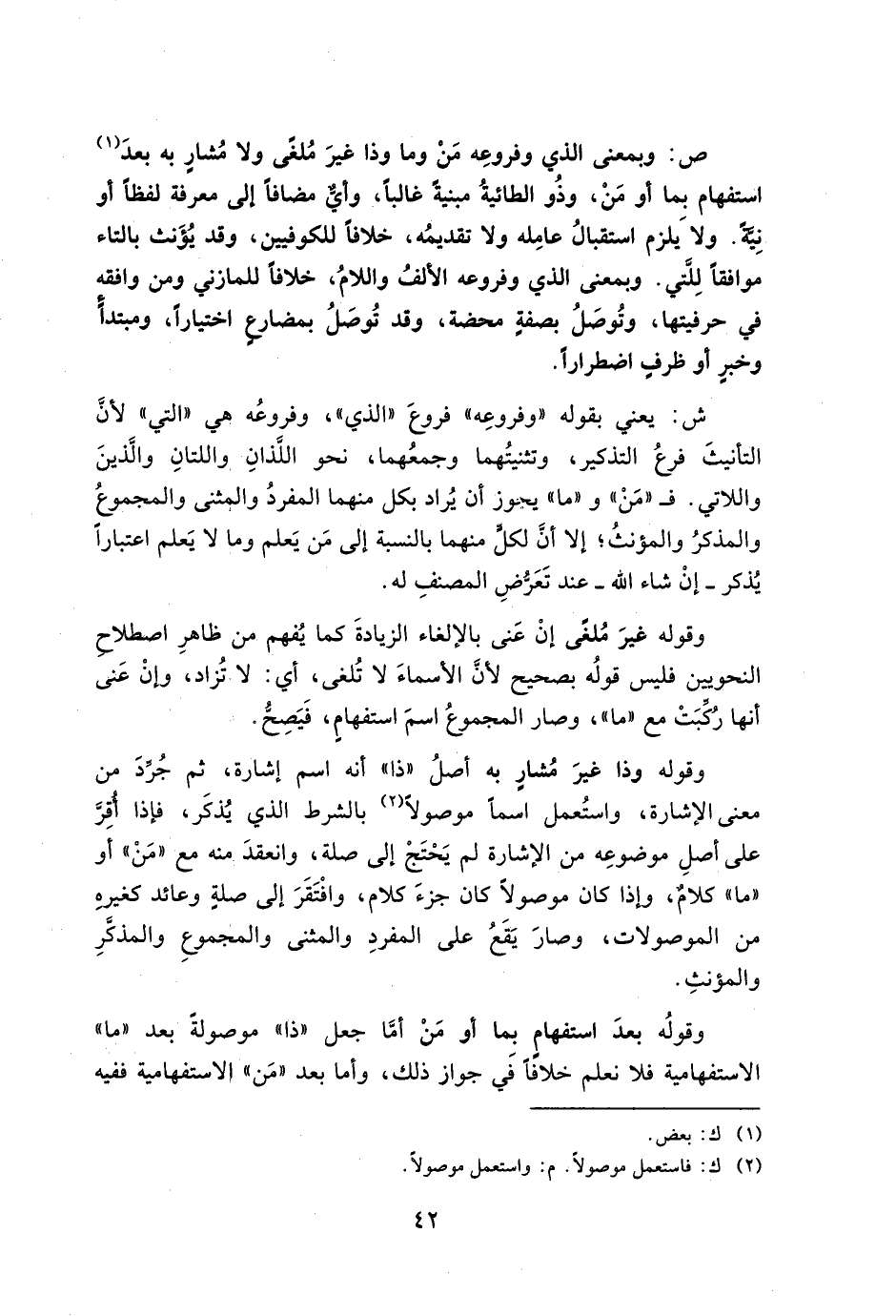 ش: يعني بقوله "وفروعه" فروع "الذي"، وفروعه هي "التي" لأن التأنيث فرع التذكير، وتثنيتهما وجمعهما، نحو اللذان واللتان، والذين واللاتي. فـ "من" و"ما" يجوز أن يراد بكل منهما المفرد والمثنى والمجموع والمذكر والمؤنث؛ إلا أن لكل منهما بالنسبةً إلى ثم يعلم وما لا تعلم اعتبارًا يذكر - إن شاء الله. عند تعرض المصنف له.