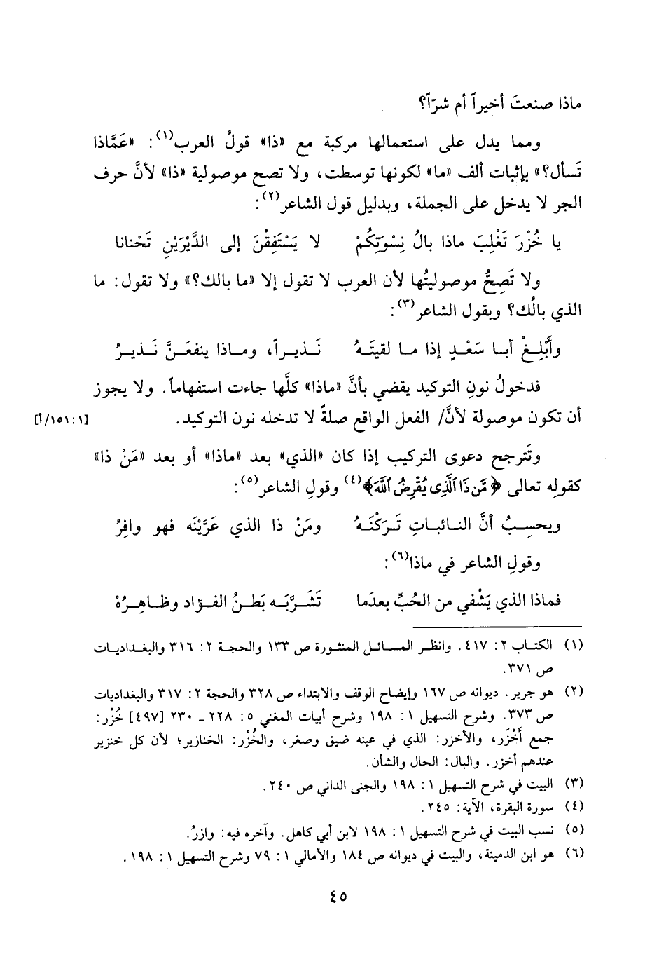 وتترجح دعوى التركيب إذا كان "الذي"بعد "ماذا" أو بعد "من ذا" كقوله تعالى {مَّن ذَا الَّذِي يُقْرِضُ اللَّهَ} وقول الشاعر: