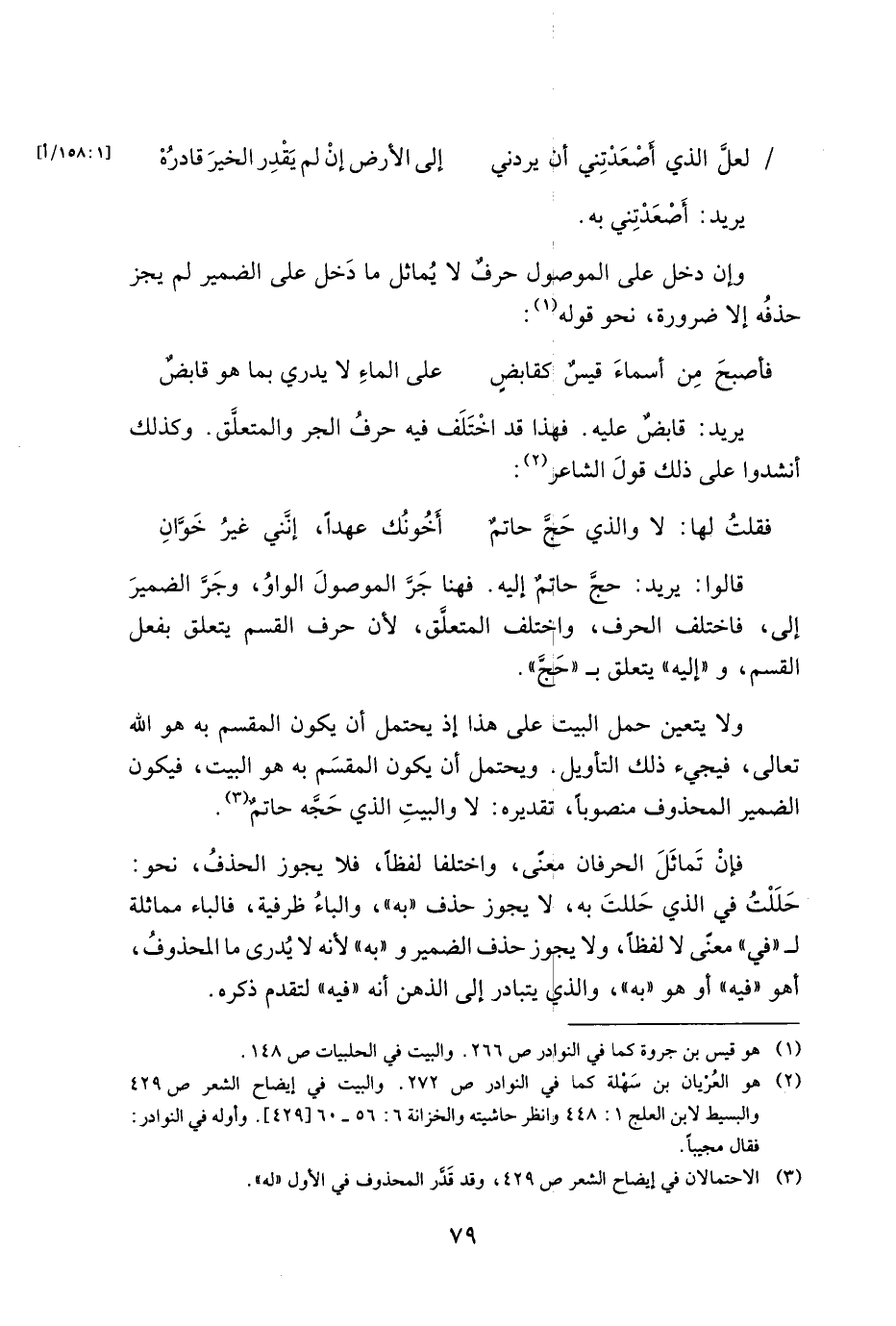 ولا يتعين حمل البيت علي هذا إذ يحتمل أن يكون المقسم به هو الله تعالي, فيجيء ذلك التأويل. ويحتمل أن يكون المقسم به هو البيت, فيكون الضمير المحذوف منصوبا, تقديره: لا والبيت الذي حجه حاتم.
