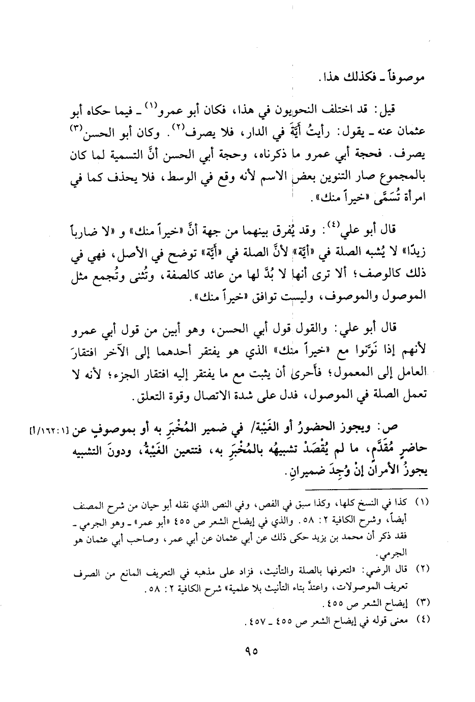 قال أبو علي: والقول قول أبي الحسن، وهو أبين من قول أبي عمرو لأنهم إذا نونوا مع "خيراً منك" الذي هو يفتقر أحدهما إلى الآخر افتقار العامل إلى المعمول، فأحرى أن يثبت مع ما يفتقر إليه افتقار الجزء، لأنه لا تعمل الصلة في الموصول، فدل على شدة الاتصال وقوة التعلق.