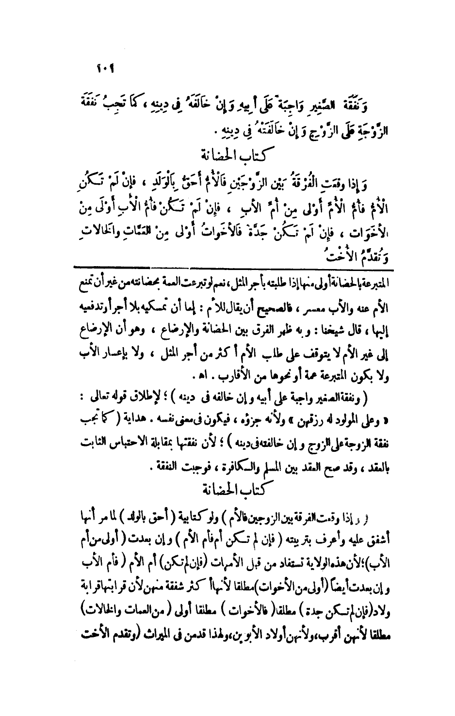 - وإذا وقعت الفرقة بين الزوجين فالأم أحق بالولد، فإن لم تكن الأم فأم الأم أولى من أم الأب، فإن لم تكن فأم الأب أولى من الأخوات، فإن لم تكن جدةٌ فالأخوات أولى من العمات والخالات وتقدم الأخت
