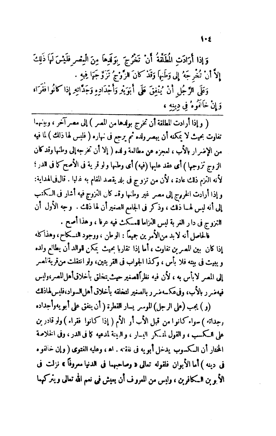 فالحاصل أنه لابد من الأمرين جميعاً: الوطن، ووجود النكاح، وهذا كله إذا كان بين المصرين تفاوت، أما إذا تقاربا بحيث يمكن للوالد أن يطالع ولده ويبيت في بيته فلا بأس، وكذا الجواب في القريتين، ولو انتقلت من قرية المصر إلى المصر لا بأس به، لأن فيه نظراً للصغير حيث يتخلق بأخلاق أهل المصر، وليس فيه ضرر بالأب، وفي عكسه ضرر بالصغير لتخلقه بأخلاق بأخلاق أهل السواد، فليس لها ذلك (و) يجب (على الرجل) الموسر يسار القطرة (أن ينفق على أبويه وأجداده وجداته) سواء كانوا من قبل الأب أو الأم (إذا كانوا فقراء) ولو قادرين على الكسب، والقول لمنكر اليسار، والبينة لمدعيه كما في الدر، وفي الخلاصة المختار أن الكسوب يدخل أبويه في نفقته. اهـ، وعليه الفتوى (وإن خالفوه في دينه) أما الأبوان فلقوله تعالى {وصاحبهما في الدنيا معروفاً} نزلت في الأبوين الكافرين، وليس من المعروف أن يعيش في نعم الله تعالى ويتركهما