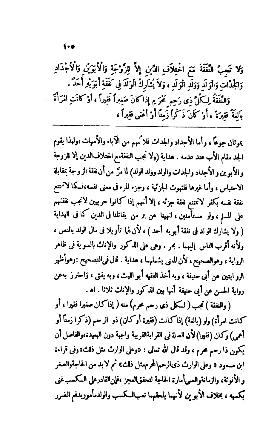 ولا تجب النفقة مع اختلاف الدين إلا للزوجة والأبوين والأجداد والجدات والولد وولد الولد، ولا يشارك الولد في نفقة أبويه أحدٌ.