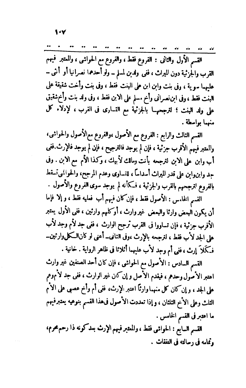 القسم الثالث والرابع: الفروع مع الأصول، والفروع مع الأصول والحواشي، والمعتبر فيهم الأقرب جزئية، فإن لم يوجد فالترجيح، فإن لم يوجد فالإرث، ففي أب وابن على الابن لترجحه بأنت ومالك لأبيك، وكذا الأم مع الابن. وفي جد وابن وابن على قدر الميراث أسداساً، للتساوي وعدم المرجح، والحواشي تسقط بالفروع لترجحهم بالقرب والجزئية، فكأنه لم يوجد سوى الفروع والأصول.