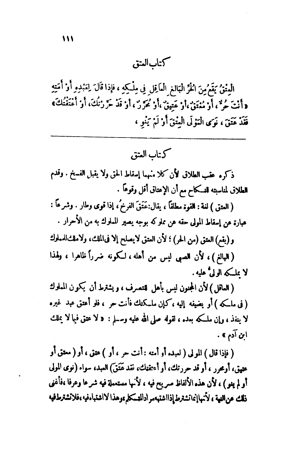 - العتق يقع من الحر البالغ العاقل في ملكه، فإذا قال لعبده أو أمته (أنت حرٌ، أو معتقٌ، أو عتيقٌ، أو محررٌ، أو قد حررتك، أو أعتقتك) فقد عتق، نوى المولى العتق أو لم ينو،