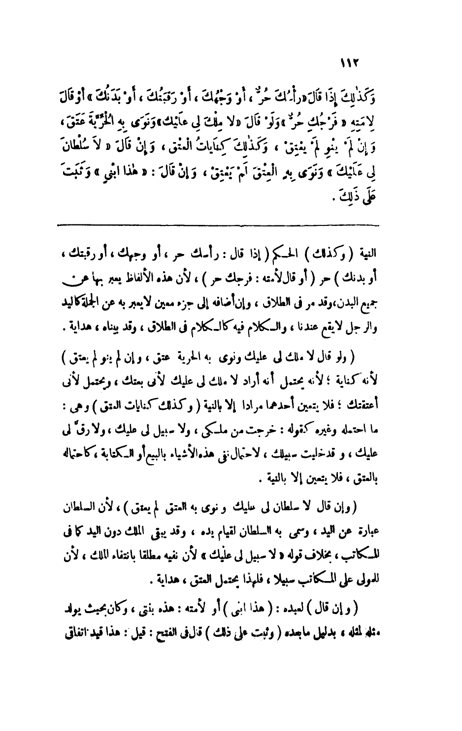وكذلك إذا قال "رأسك حرٌ، أو وجهك، أو رقبتك، أو بدنك" أو قال لأمته "فرجك حرٌ" ولو قال "لا ملك لي عليك" ونوى به الحرية عتق، وإن لم ينو لم يعتق، وكذلك كنايات العتق، وإن قال "لا سلطان لي عليك" ونوى به العتق لم يعتق، وإن قال: "هذا ابني" وثبت على ذلك.