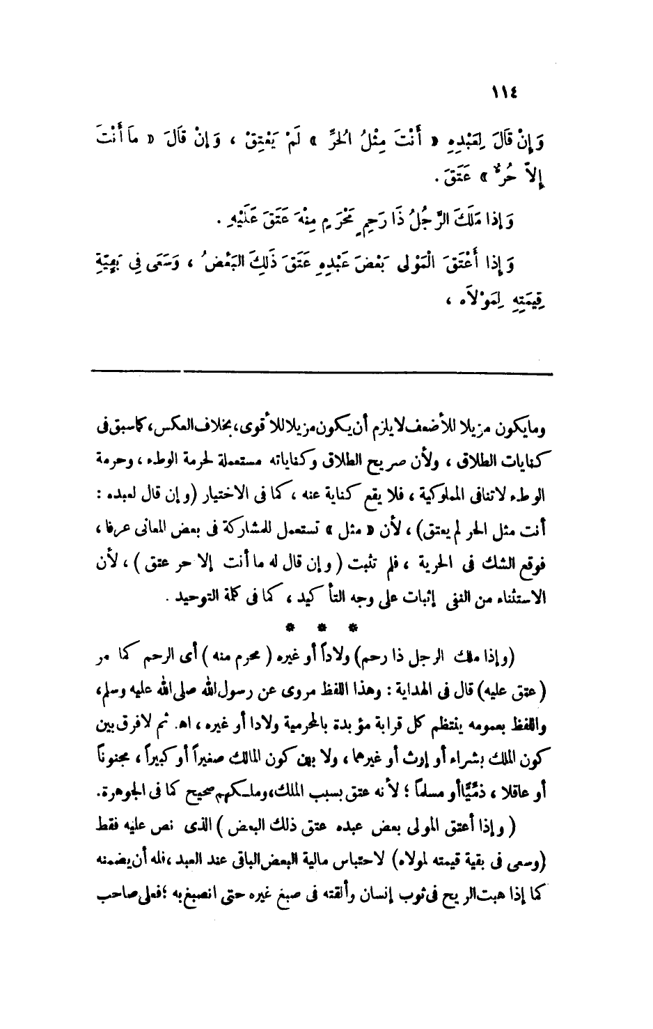 وما يكون مزيلا للأضعف لا يلزم أن يكون مزيلا للأقوى، بخلاف العكس، كا سبق في كنايات الطلاق، ولأن صريح الطلاق وكناياته مستعملة لحرمة الوطء، وحرمة الوطء لا تنافي المملوكية، فلا يقع كناية عنه، كما في الاختيار (وإن قال لعبده: أنت مثل الحر لم يعتق) ، لأن (مثل) تستعمل للمشاركة في بعض المعاني عرفا، فوقع الشك في الحرية، فلم تثبت (وإن قال له ما أنت إلا حر عتق) ، لأن الاستثناء من النفي إثبات على وجه التأكيد، كما في كلمة التوحيد.