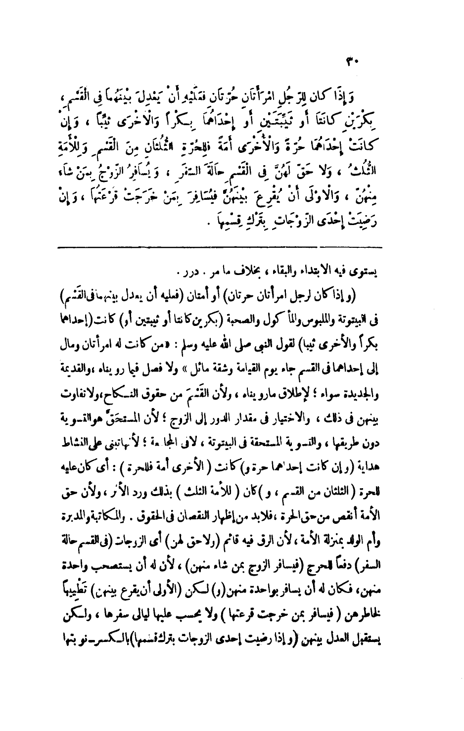 وإذا كانت للرجل امرأتان حرتان فعليه أن يعدل بينهما في القسم، بكرين كانت أو ثيبتين أو إحداهما بكراً والأخرى ثيباً، وإن كانت إحداهما حرةً والأخرى أمةً فللحرة الثلثان من القسم وللأمة الثلث، ولا حق لهن في القسم حالة السفر، ويسافر الزوج بمن شاء منهن، والأولى أن يقرع بينهن فيسافر بمن خرجت قرعتها، وإن رضيت إحدى الزوجات بترك قسمها.