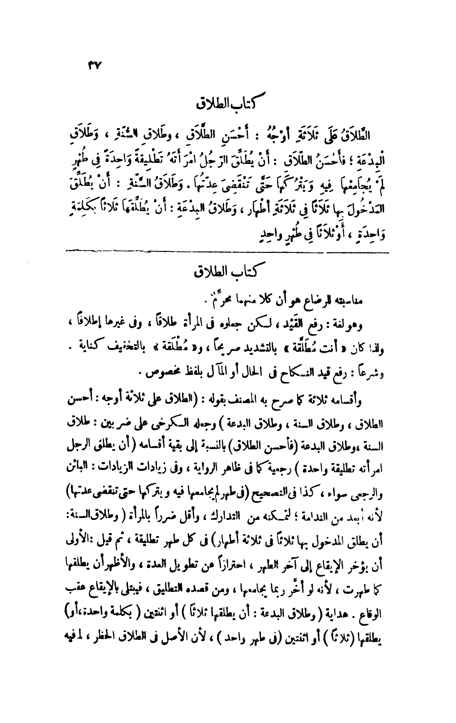 وأقسامه ثلاثة كما صرح به المصنف بقوله: (الطلاق على ثلاثة أوجه: أحسن الطلاق، وطلاق السنة، وطلاق البدعة) وجعله الكرخي على ضربين: طلاق السنة، وطلاق البدعة (فأحسن الطلاق) بالنسبة إلى بقية أقسامه (أن يطلق الرجل امرأته تطليقة واحدة) رجعية كما في ظاهر الرواية، وفي زيادات الزيادات: البائن والرجعي سواء، كذا في التصحيح (في طهر لم يجامعها فيه ويتركها حتى تنقضي عدتها) لأنه أبعد من الندامة؛ لتمكنه من التدارك، وأقل ضرراً بالمرأة (وطلاق السنة: أن يطلق المدخول بها ثلاثاً في ثلاثة أطهار) في كل طهر تطليقة، ثم قيل: الأولى أن يؤخر الإيقاع إلى آخر الطهر، احترازاً عن تطويل العدة، والأظهر أن يطلقها كما طهرت، لأنه لو أخر ربما يجامعها، ومن قصده التطليق، فيبتلى بالإيقاع عقب الوقاع. هداية (وطلاق البدعة: أن يطلقها ثلاثاً) أو اثنتين (بكلمة واحدة، أو) يطلقها (ثلاثا) أو اثنتين (في طهر واحد) ، لأن الأصل في الطلاق الحظر، لما فيه