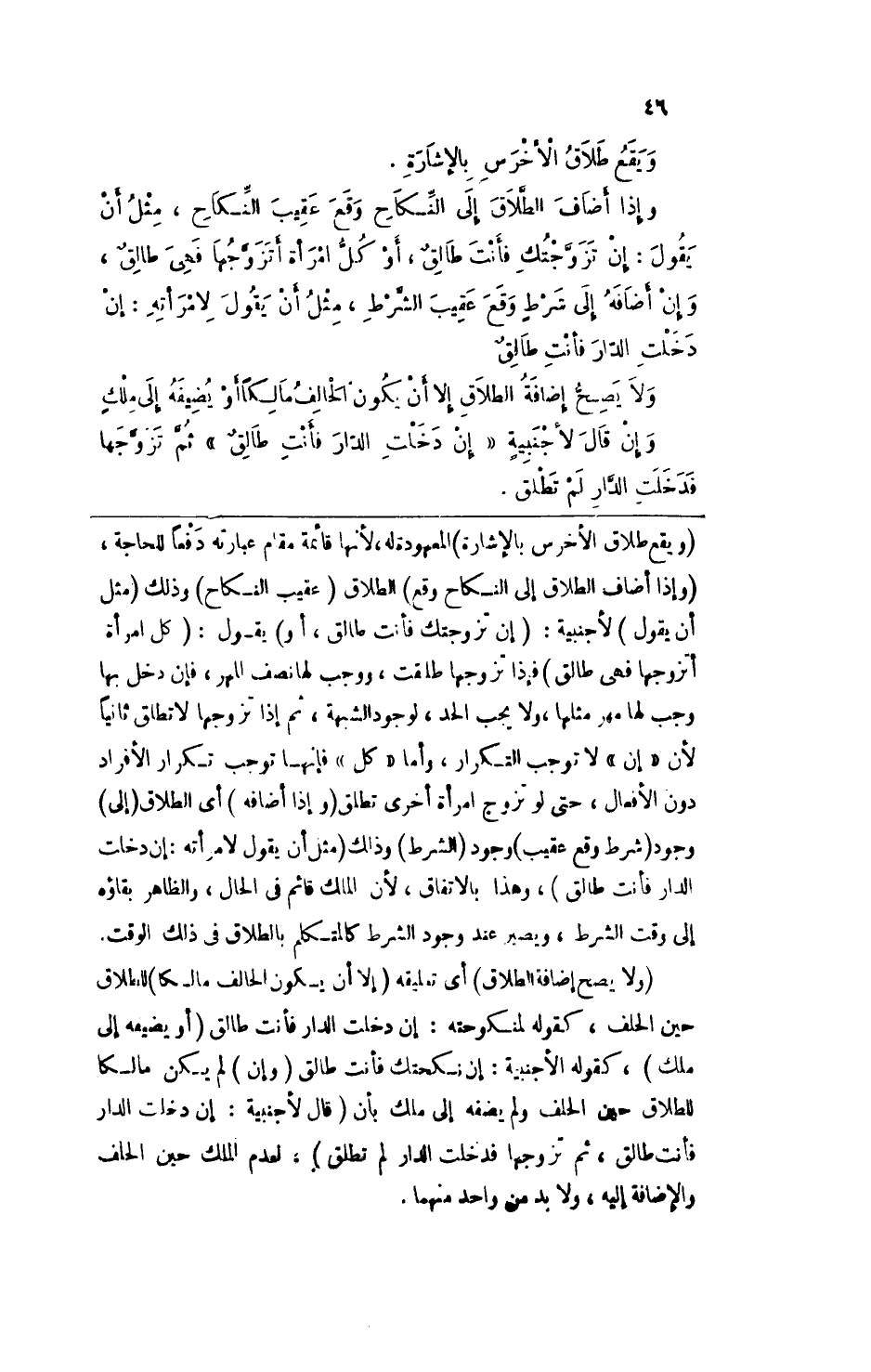 (ويقع طلاق الأخرس بالإشارة) المعهودة له، لأنها قائمة مقام عبارته دفعاً للحاجة، (وإذا أضاف الطلاق إلى النكاح وقع) الطلاق (عقيب النكاح) وذلك (مثل أن يقول) لأجنبية: (إن تزوجتك فأنت طالق، أو) يقول: (كل امرأة أتزوجها فهي طالق) فإذا تزوجها طلقت، ووجب لها نصف المهر، فإن دخل بها وجب لها مهر مثلها، ولا يجب الحد، لوجود الشبهة، ثم إذا تزوجها لا تطلق ثانياً لأن "إن" لا توجب التكرار، وأما " كل" فإنها توجب تكرار الأفراد دون الأفعال، حتى لو تزوج امرأة أخرى تطلق (وإذا أضافه) أي الطلاق (إلى) وجود (شرط وقع عقيب) وجود (الشرط) وذلك (مثل أن يقول لامرأته: إن دخلت الدار فأنت طالق) ، وهذا بالاتفاق، لأن الملك قائم في الحال، والظاهر بقاؤه إلى وقت الشرط، ويصير عند وجود الشرط كالمتكلم بالطلاق في ذلك الوقت. (ولا يصح إضافة الطلاق) أي تعليقه (إلا أن يكون الحالف مالكا) للطلاق حين الحلف، كقوله لمنكوحته: إن دخلت الدار فأنت طالق (أو يضيفه إلى ملك) ، كقوله الأجنبية: إن نكحتك فأنت طالق (وإن) لم يكن مالكا للطلاق حين الحلف ولم يضفه إلى ملك بأن (قال لأجنبية: إن دخلت الدار فأنت طالق، ثم تزوجها فدخلت الدار لم تطلق) ، لعدم الملك حين الحلف والإضافة إليه، ولابد من واحد منهما