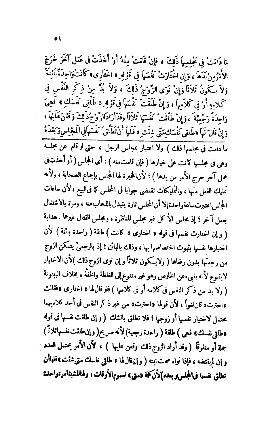 ما دامت في مجلسها ذلك، فإن قامت منه أو أخذت في عملٍ آخر خرج الأمر من يدها، وإن اختارت نفسها في قوله "اختاري" كانت واحدةً بائنةً ولا يكون ثلاثاً وإن نوى الزوج ذلك، ولابد من ذكر النفس في كلامه أو في كلامها، وإن طلقت نفسها في قوله " طلقي نفسك" فهي واحدةٌ رجعيةٌ، وإن طلقت نفسها ثلاثاً وقد أراد الزوج ذلك وقعن عليها، وإن قال لها "طلقي نفسك متى شئت" فلها أن تطلق نفسها في المجلس وبعده وإذا قال لرجلٍ "طلق امرأتي" فله أن يطلقها في المجلس وبعده،