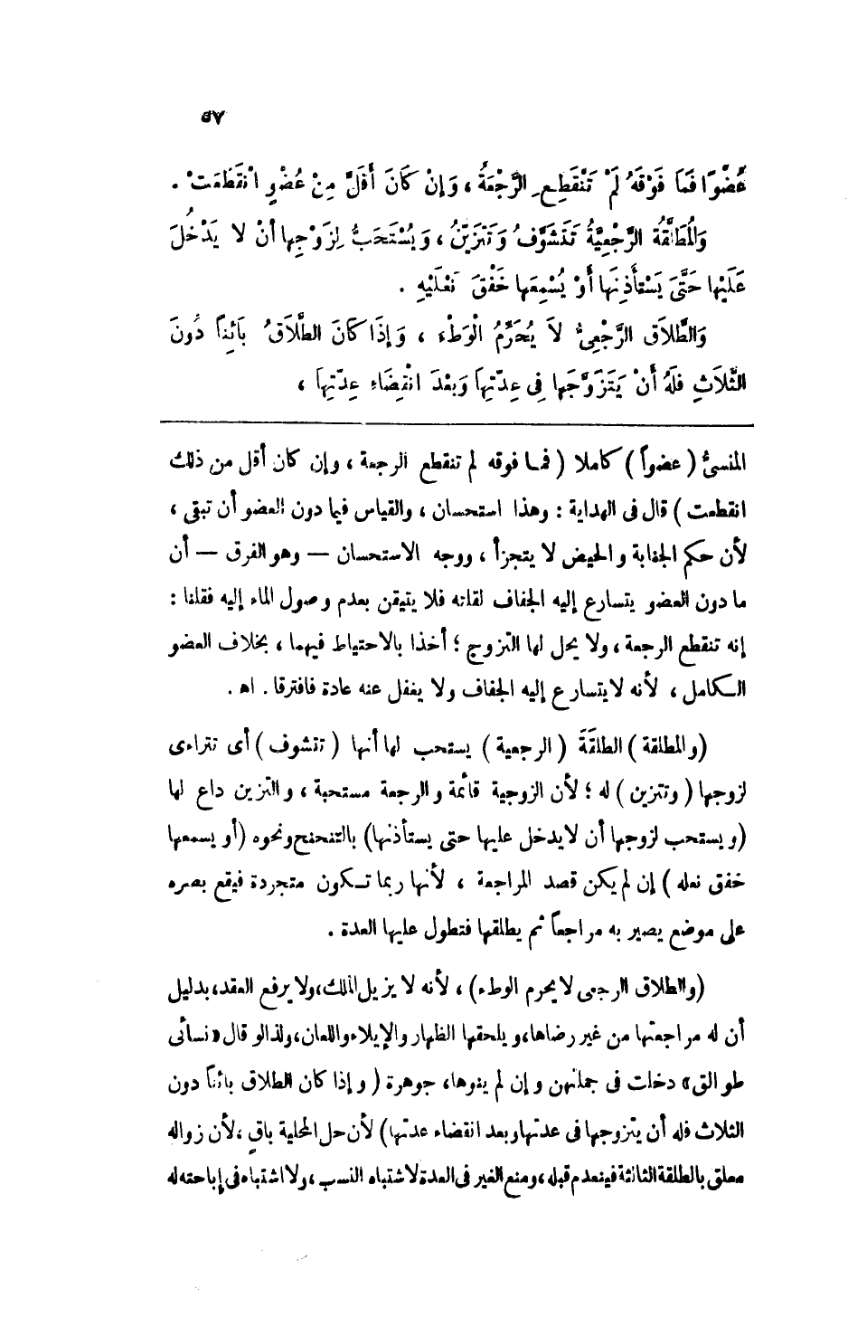 المنسي (عضواً) كاملا (فما فوقه لم تنقطع الرجعة، وإن كان أقل من ذلك انقطعت) قال في الهداية: وهذا استحسان، والقياس فيما دون العضو أن تبقى، لأن حكم الجنابة والحيض لا يتجزأ، ووجه الاستحسان - وهو الفرق - أن ما دون العضو يتسارع إليه الجفاف لقلته فلا يتيقن بعدم وصول الماء إليه فقلنا: إنه تنقطع الرجعة، ولا يحل لها التزوج؛ أخذاً بالاحتياط فيهما، بخلاف العضو الكامل، لأنه لا يتسارع إليه الجفاف ولا يغفل عنه عادة فافترقا. اهـ.