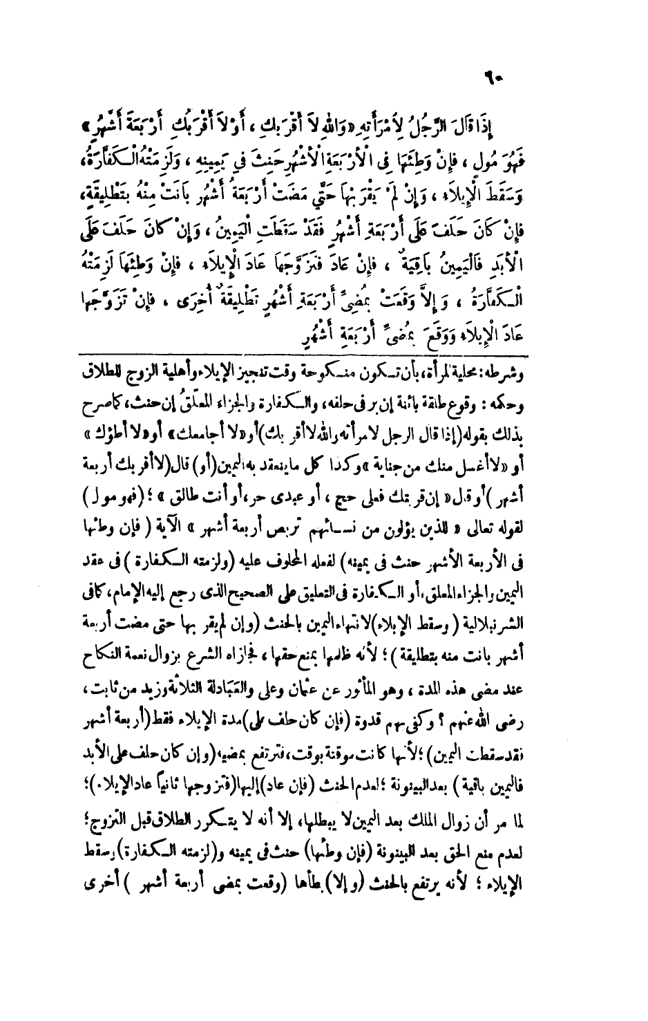 وشرطه: محلية المرأة، بأن تكون منكوحة وقت تنجيز الإيلاء وأهلية الزوج للطلاق وحكمه، وقوع طلقة بائنة إن بر في حلفه، والكفارة والجزاء المعلق إن حنث، كما صرح بذلك بقوله (إذا قال الرجل لامرأته والله لا أقربك) أو (لا أجامعك) أو (لا أطؤك) أو (لا أغسل منك من جنابة) وكذا كل ما ينعقد به اليمين (أو) قال (لا أقربك أربعة أشهر) أو قال (إن قربتك فعلى حج أو عبدي حر، أو أنت طالق) ؛ (فهو مول) لقوله تعالى {للذين يؤلون من نسائهم تربص أربعة أشهر} الآية (فإن وطئها في الأربعة أشهر حنث في يمينه) لفعله المحلوف عليه (ولزمته الكفارة) في عقد اليمين والجزاء المعلق، أو الكفارة في التعليق على الصحيح الذي رجع إليه الإمام، كما في الشرنبلالية (وسقط الإيلاء) لانتهاء اليمين بالحنث (وإن لم يقربها حتى مضت أربعة أشهر بانت منه بتطليقة) ؛ لأنه ظلمها بمنع حقها، فجازاه الشرع بزوال نعمة النكاح عند مضي هذه المدة، وهو المأثور عن عثمان وعلي والعبادلة الثلاثة وزيد بن ثابت، رضي الله عنهم، وكفى بهم قدوة (فإن كان حلف على) مدة الإيلاء فقط (أربعة أشهر فقد سقطت اليمين) ؛ لأنها كانت موقنة بوقت، فترتفع بمضيه (وإن كان حلف على الأبد فاليمين باقية) بعد البينونة؛ لعدم الحنث (فإن عاد) إليها (فتزوجها ثانياً عاد الإيلاء) ؛ لما مر أن زوال الملك بعد اليمين لا يبطلها، إلا أنه لا يتكرر الطلاق قبل التزوج؛ لعدم منع الحق بعد البينونة (فإن وطئها) حنث في يمينه و (لزمته الكفارة) وسقط الإيلاء؛ لأنه يرتفع بالحنث (وإلا) يطأها (وقعت بمضي أربعة أشهر) أخرى